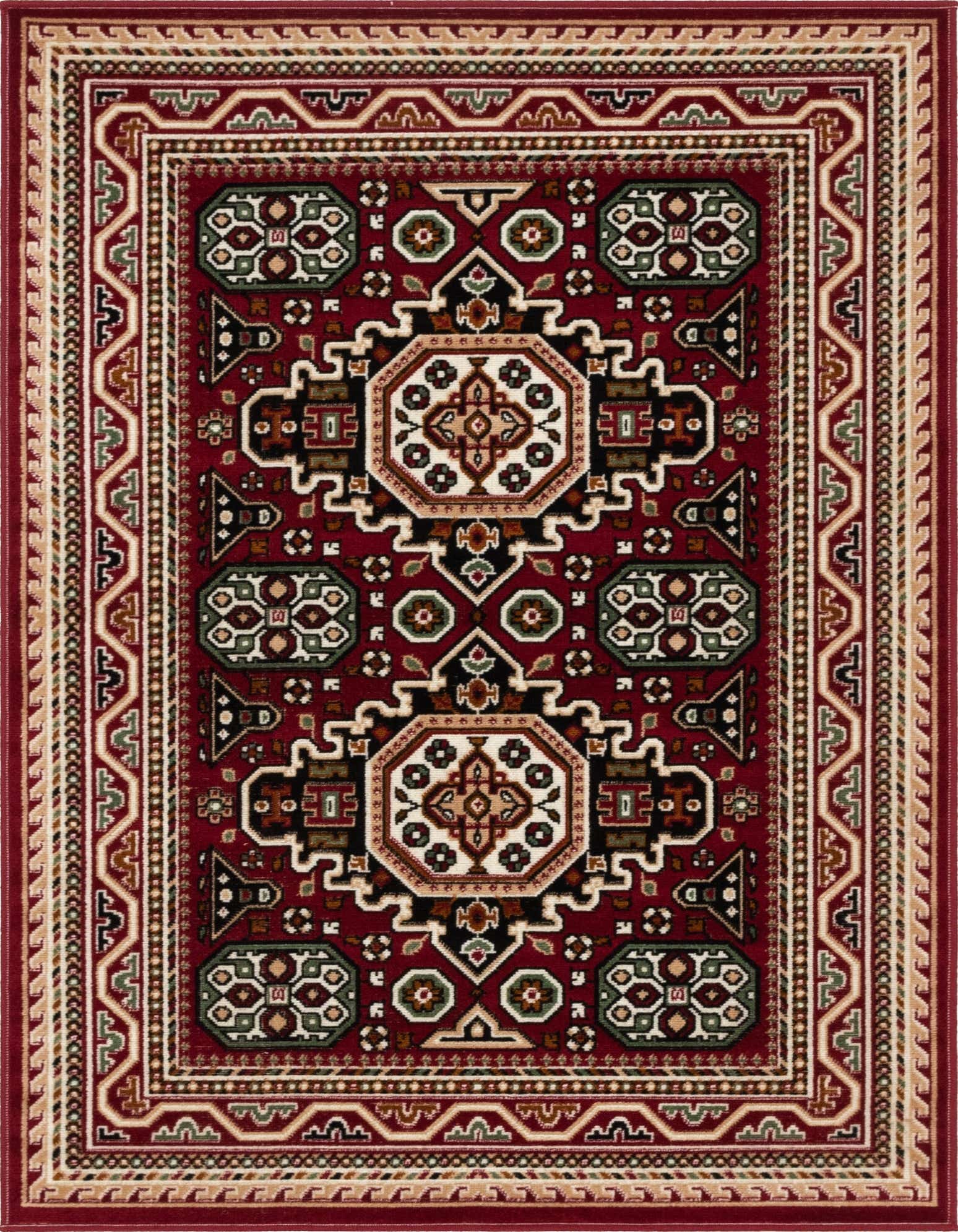 Primary color is Red. Colors in this rug include: Red, Beige, Black, Green, Ivory, Orange.