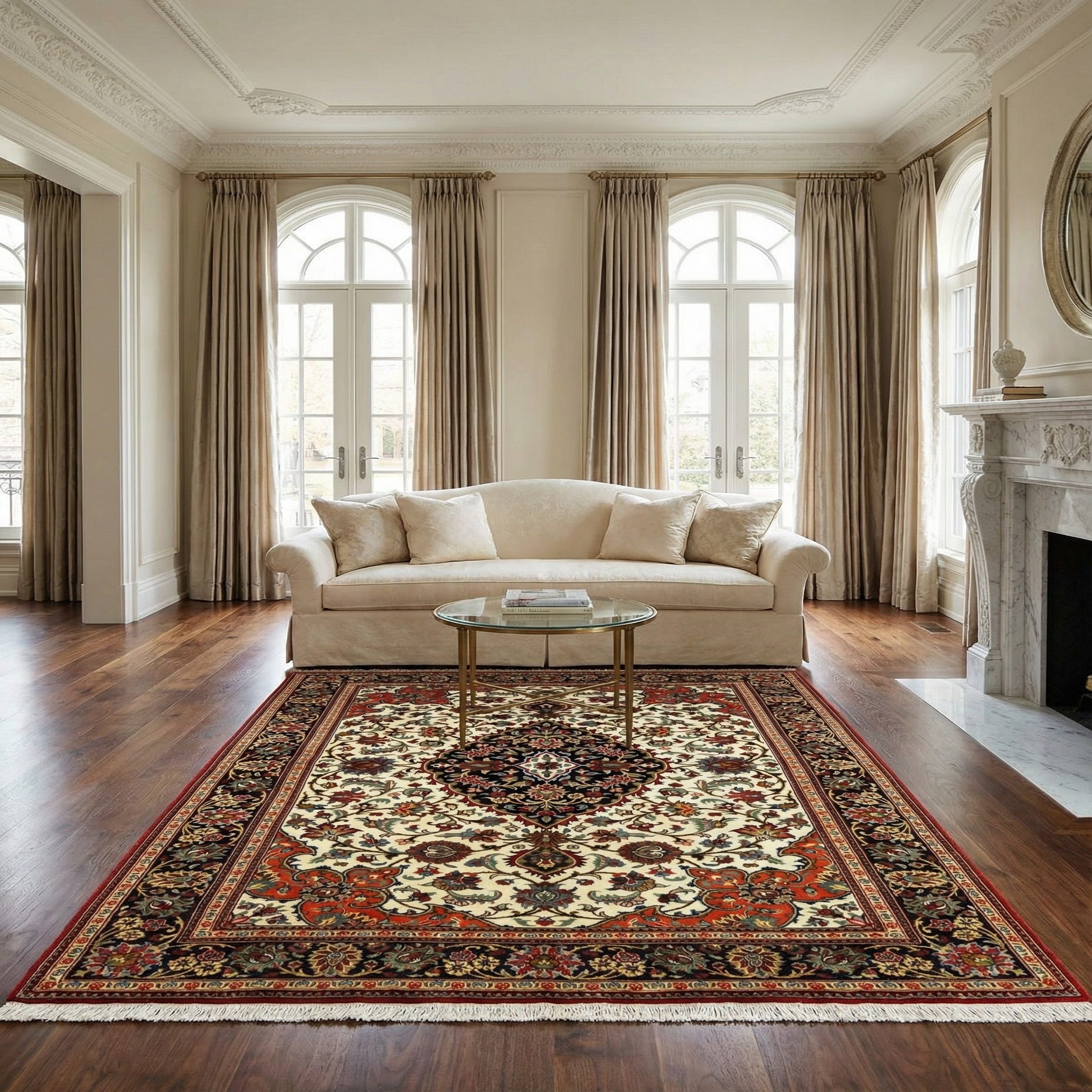 The dense weave of this rug lends itself to a textured feel, offering both visual appeal and tangible comfort underfoot. The rich color palette provides versatility, allowing this rug to serve as a statement piece or to complement existing decor with elegance. The craftsmanship and wool material ensure both durability and a plush feel, making it suitable for areas with medium foot traffic such as living rooms, studies, or bedrooms. This rug could serve as a unifying element within a space adorned with wooden furnishings, alongside warm-toned decor to accentuate its classic charm.