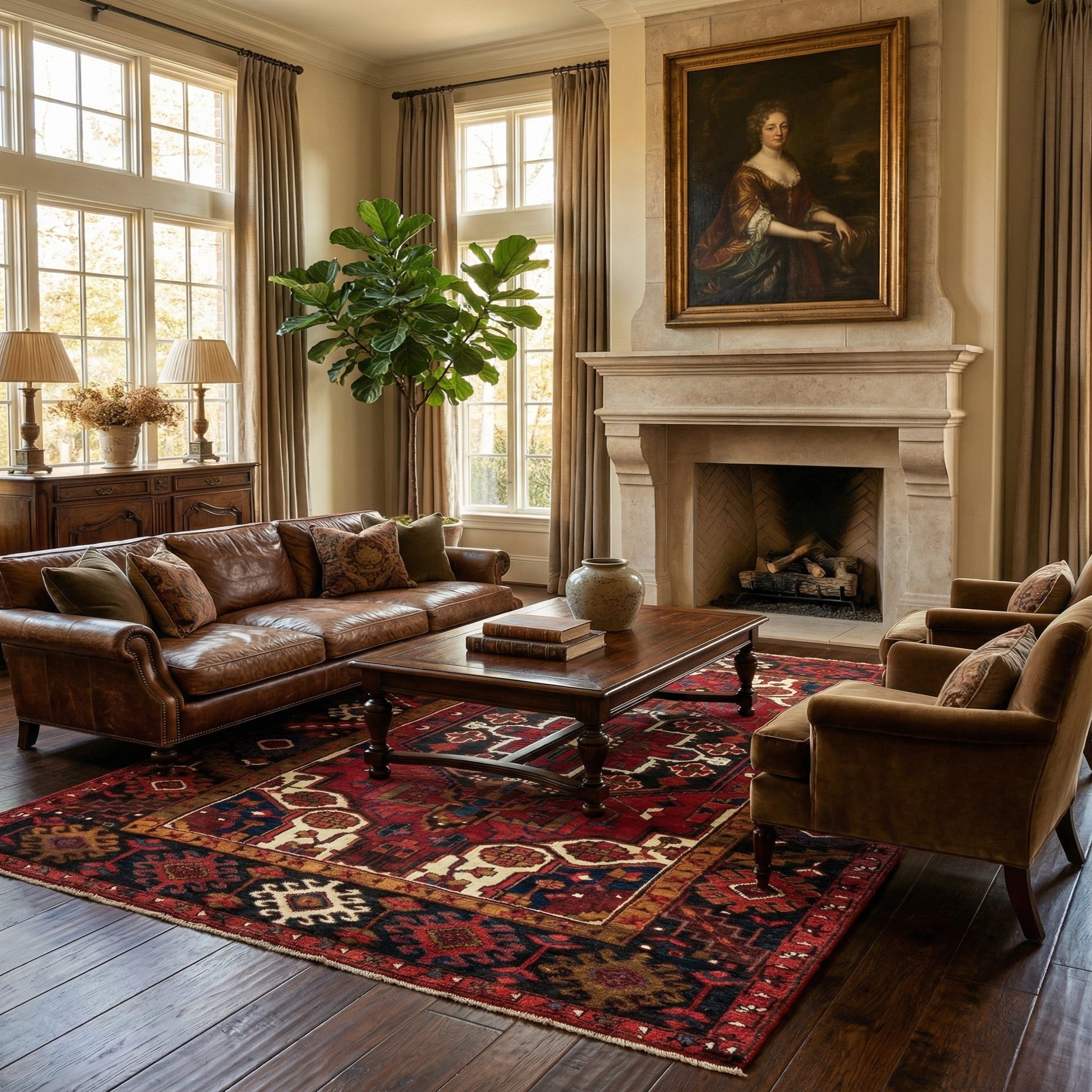 Its classic pattern and rich color palette make it an ideal choice for spaces that lean towards traditional, rustic, or eclectic decors. This rug could serve as a statement piece in a living room beneath a coffee table, in a dining area, or as an elegant touch in an office. In each scenario, it would bring warmth and character to the setting while harmonizing with both antique and contemporary furnishings.