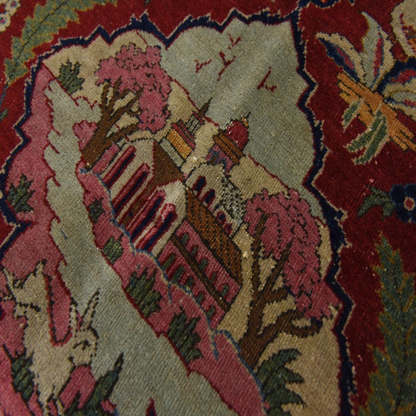 In Good condition, with Missing Fringe, Low Pile Spots, Small Spot Damage. Further details can be seen in the pictures