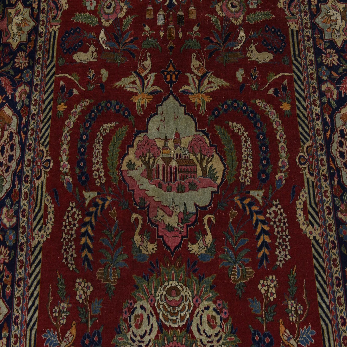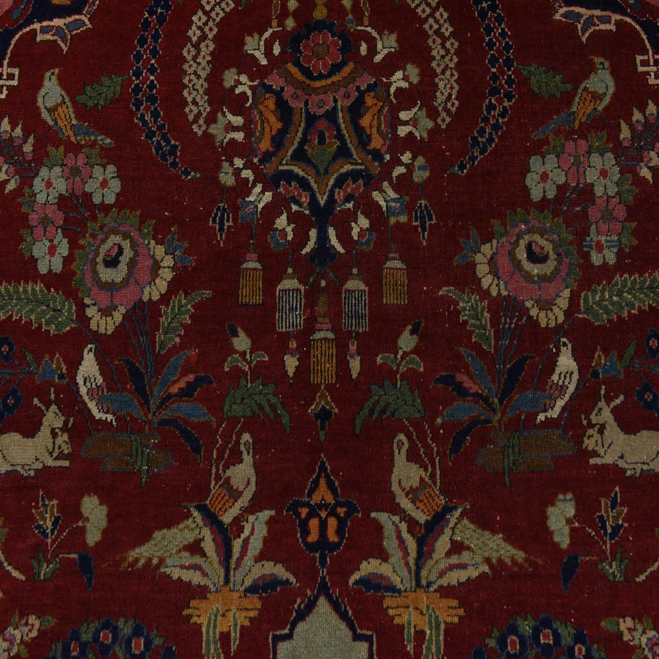 Primary color is Red. Colors in this rug include: Red, Brown, Burgundy, Green, Orange, Pink, Blue, Beige.