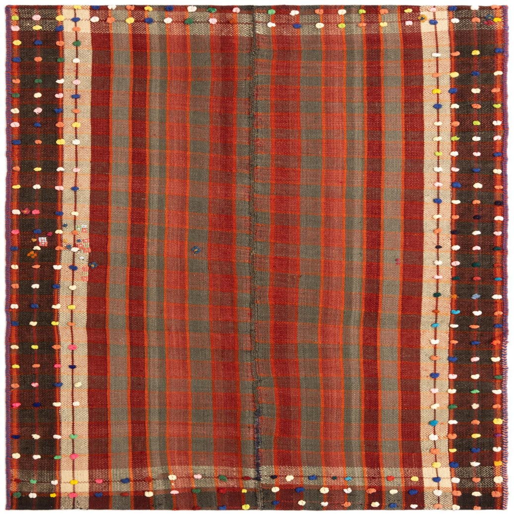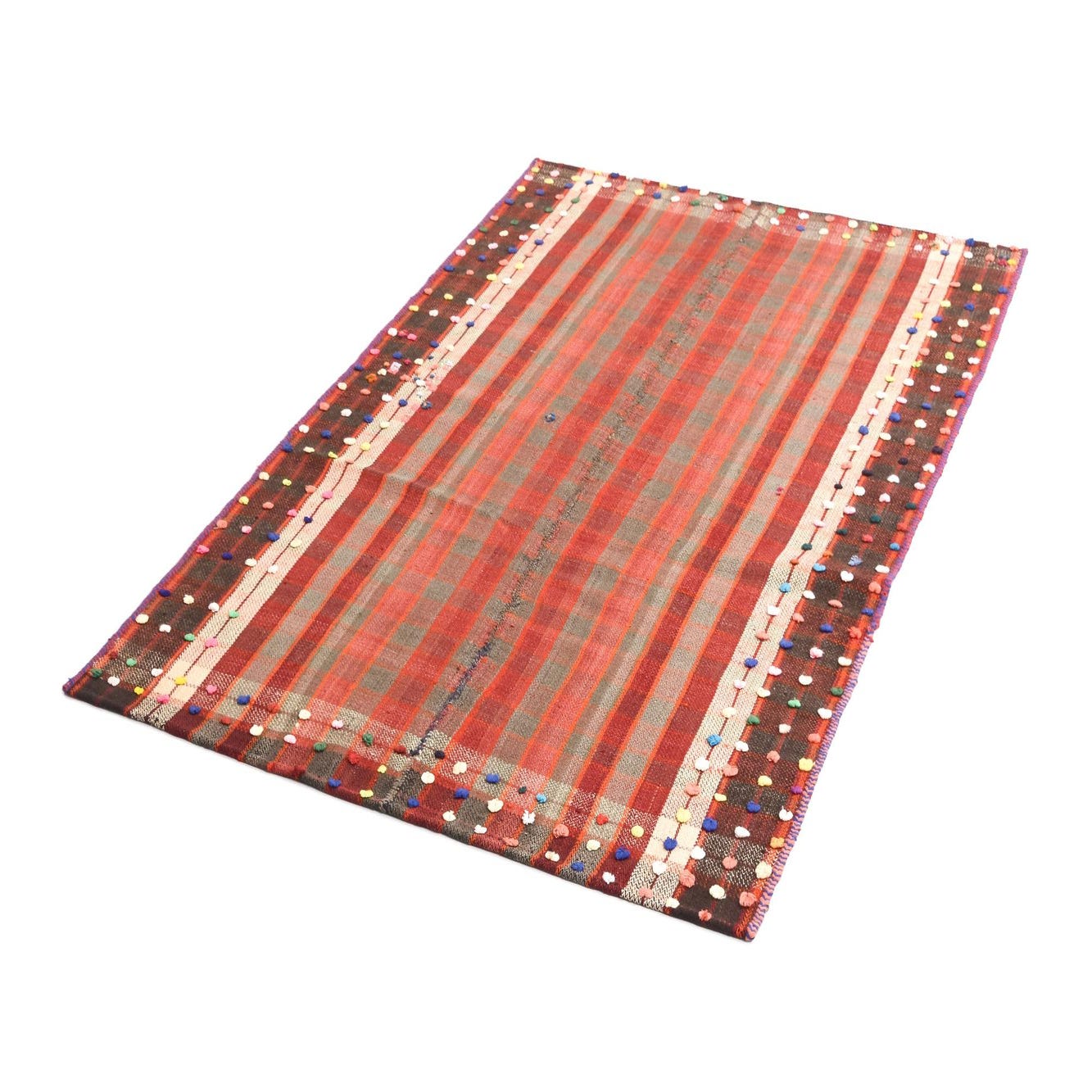 A 4x6 rectangular Jajim rug featuring a red and grey plaid pattern with colorful polka dot borders.