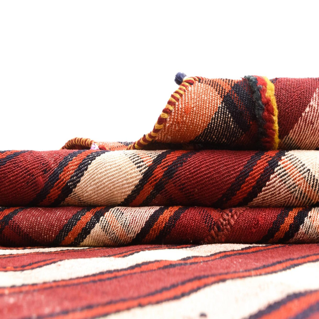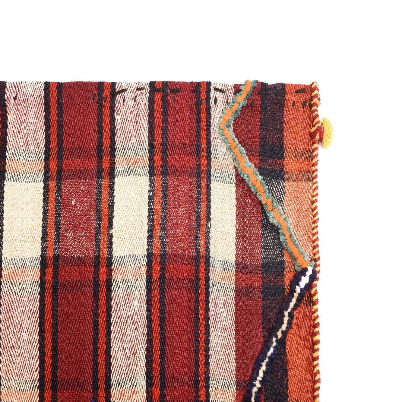The Jajim Collection offers a handcrafted wool rug with a bold, linear plaid pattern, primarily showcasing a red background intersected with accents of beige, black, and subtle hints of yellow. This 4x6 piece highlights a distinctive textural richness, provided by the natural fibers and hand-made construction. Embellished with vibrant, multi-colored selvedges on the long edges and a simple finishing on the short edges, this rug presents an aesthetic that aligns with both traditional and more contemporary interior design themes.