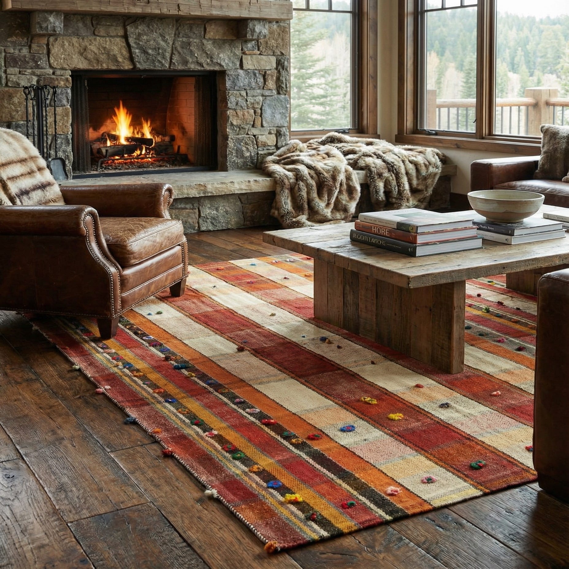 A 4x6 rectangular Jajim rug featuring a plaid pattern in shades of red, orange, and cream with colorful pom-pom accents.