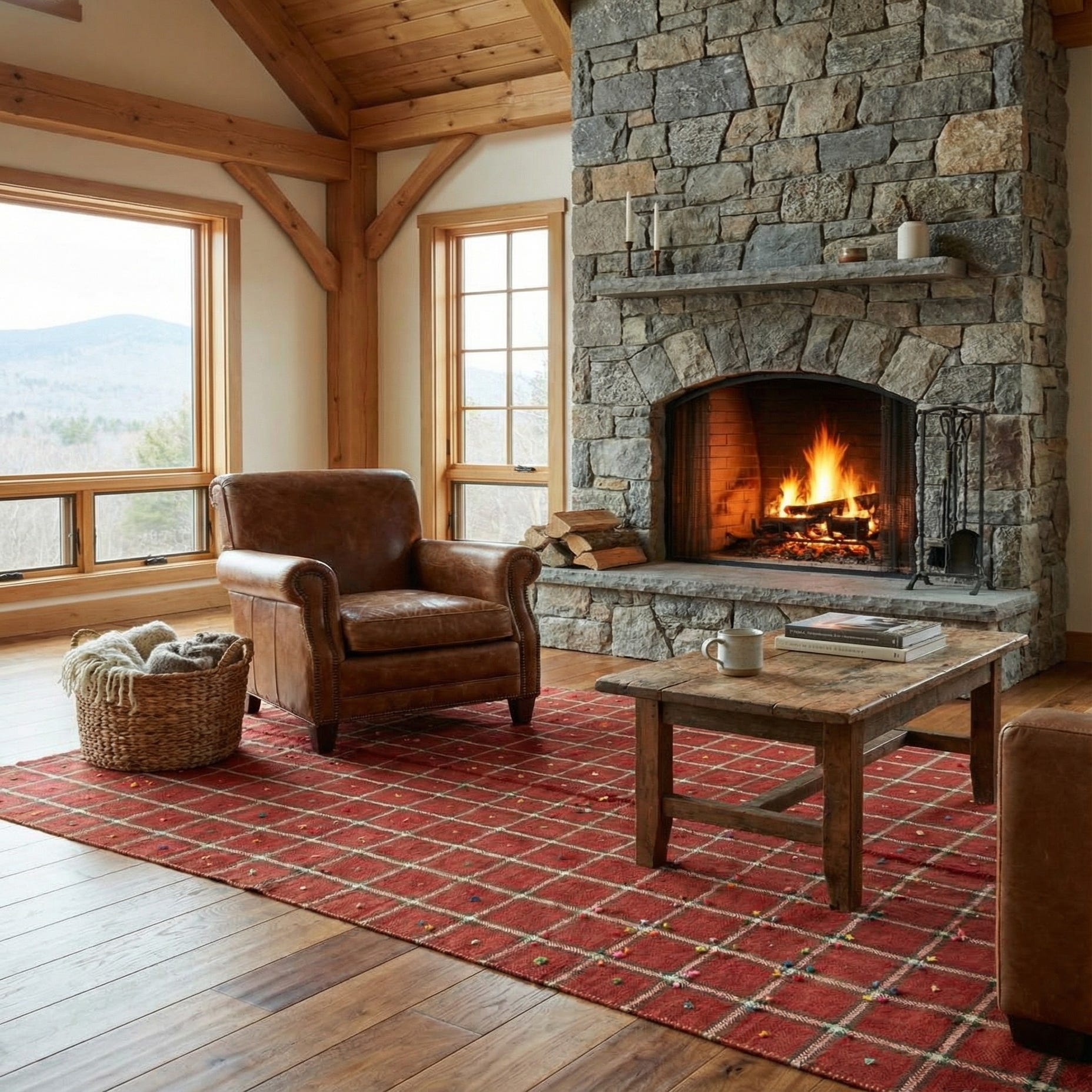 A 4x6 rectangular Jajim rug in rich red, featuring a plaid pattern with thin white and dark lines and colorful confetti-like dots, ideal for a living room.