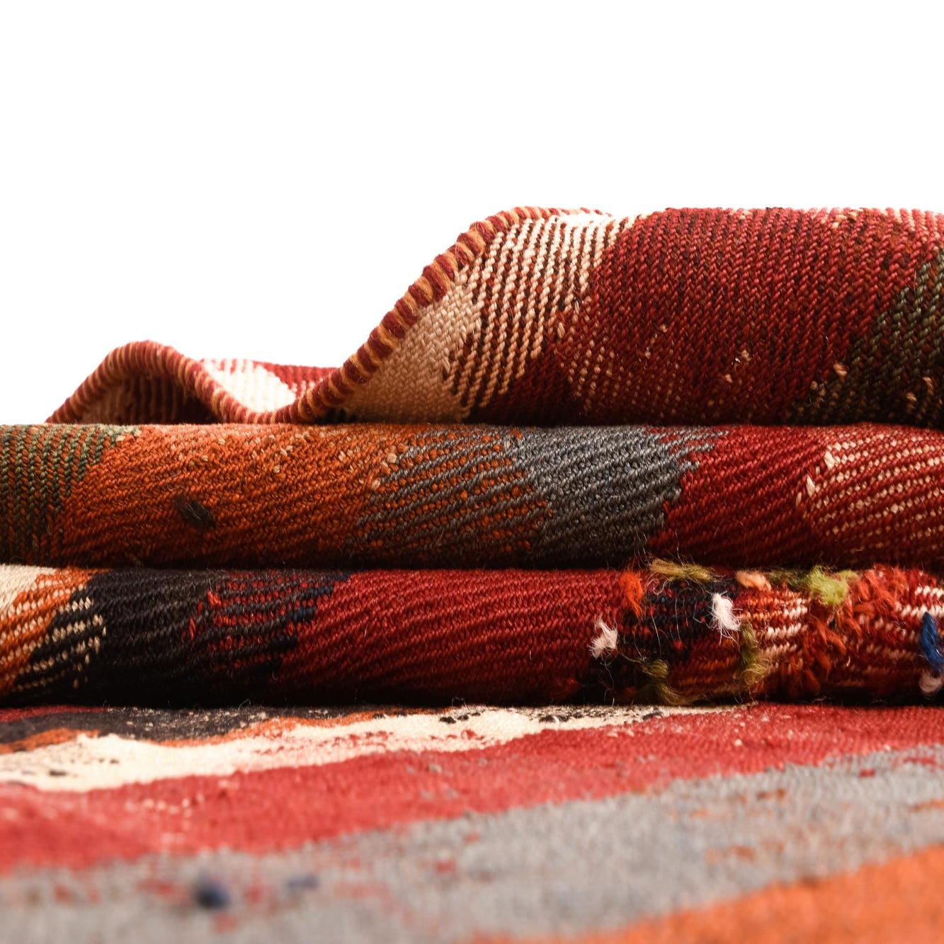 The Jajim collection presents a handcrafted wool rug measuring 4x6 feet, showcasing a vibrant palette with a bold red background. The rug features a distinctive pattern of repeating geometric motifs in complementary hues, creating a strong visual statement. Hues of brown, cream, and pops of blues enrich the design, while subtle color variations offer an artisanal charm.