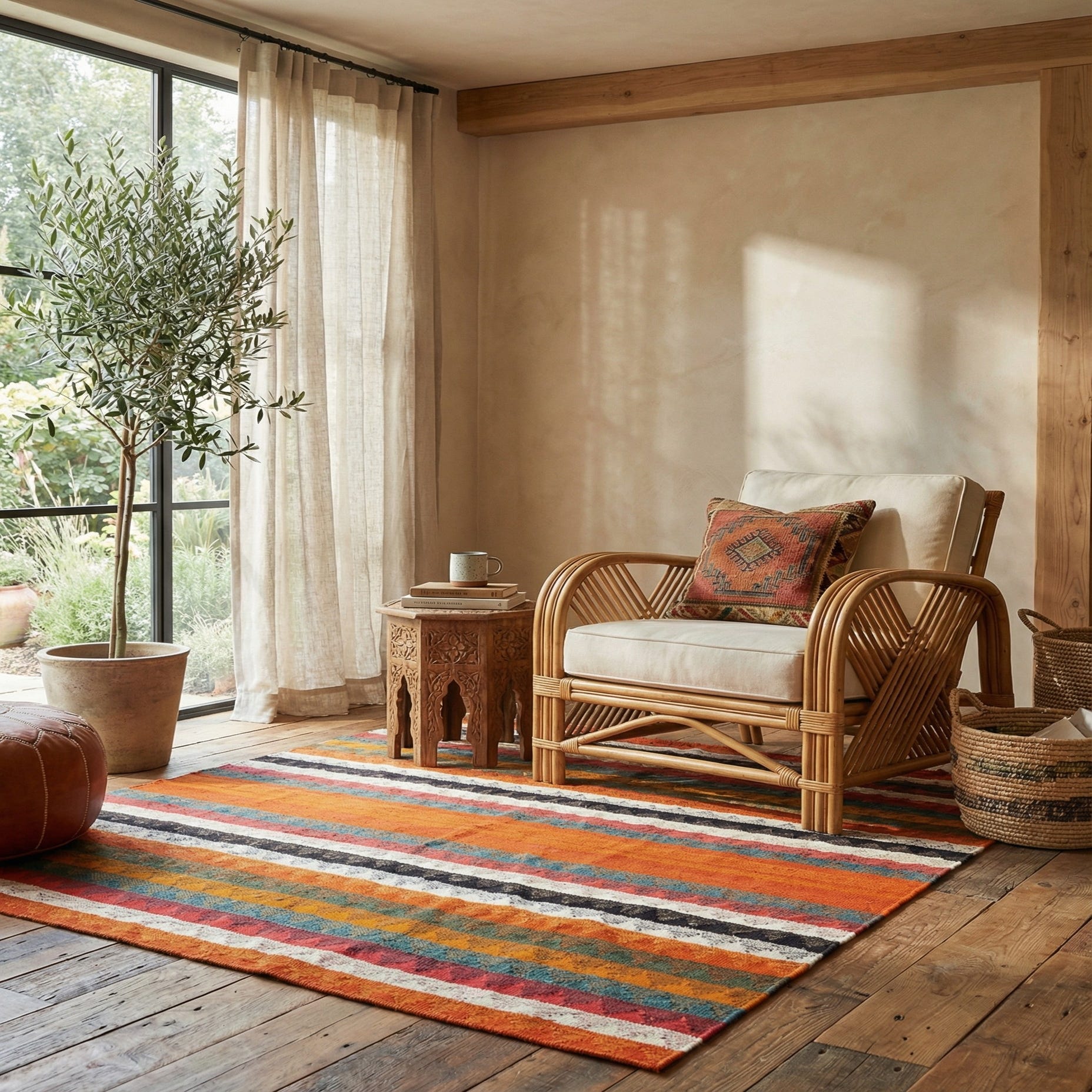 The 4x6 size is versatile, making this rug an excellent choice for an entryway, home office, or as a focal point in a smaller living room. Its striking pattern pairs well with both contemporary and traditional decor, adding a touch of warmth and color to any space. The rich color palette can serve as an accent piece to complement neutral furnishings, or it can stand out among darker wood tones for a more dramatic effect. The handcrafted nature ensures that each piece is unique, adding an authentic artisan feel to your interior design.