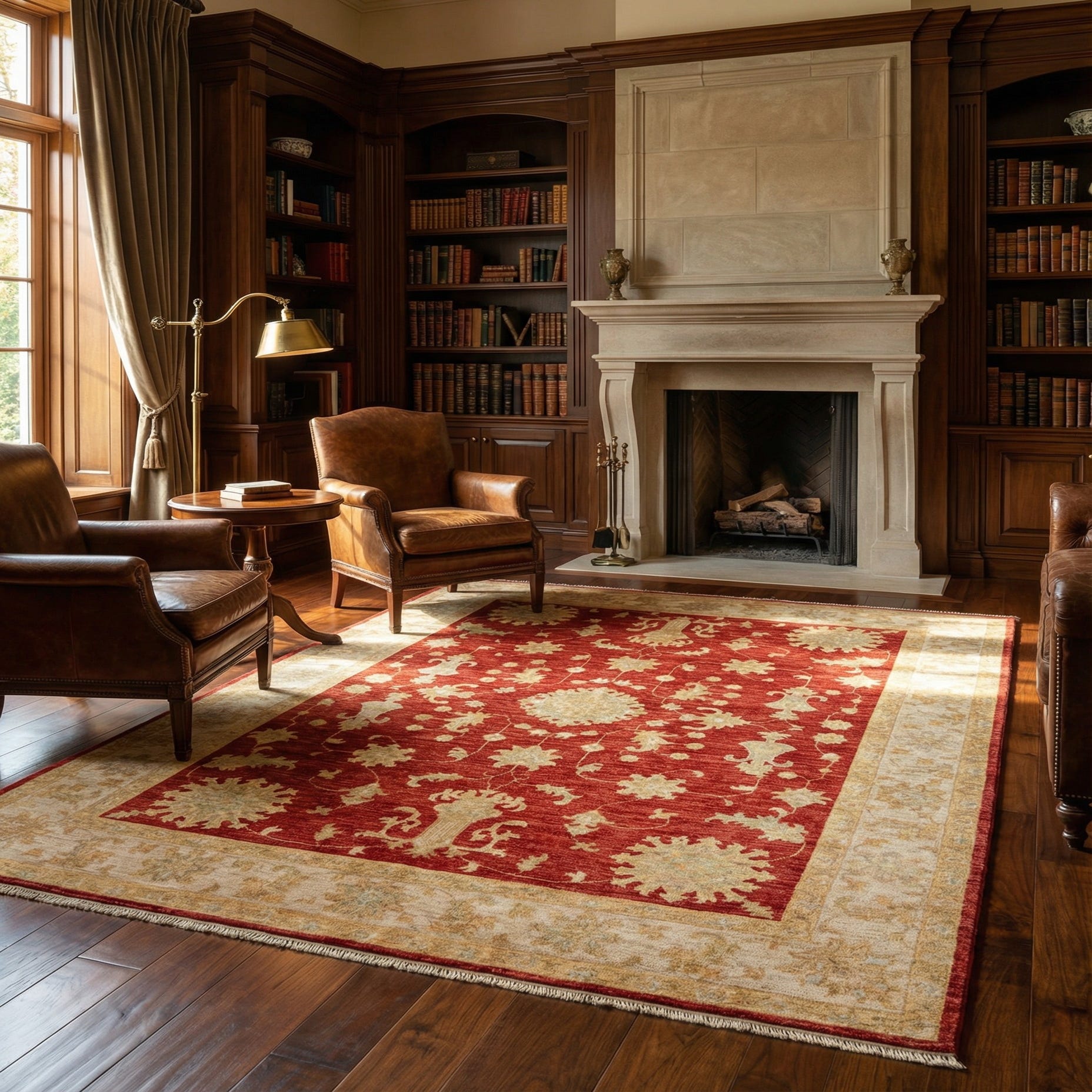 A traditional floral medallion design fills a warm red field, with graceful scrolling vines and stylized blossoms rendered in soft beige. A broad beige border frames the center, carrying smaller floral motifs that provide contrast and structure. The overall look is classic and formal, with clear symmetry and a calm color balance that highlights the deep red ground against the lighter beige ornamentation.