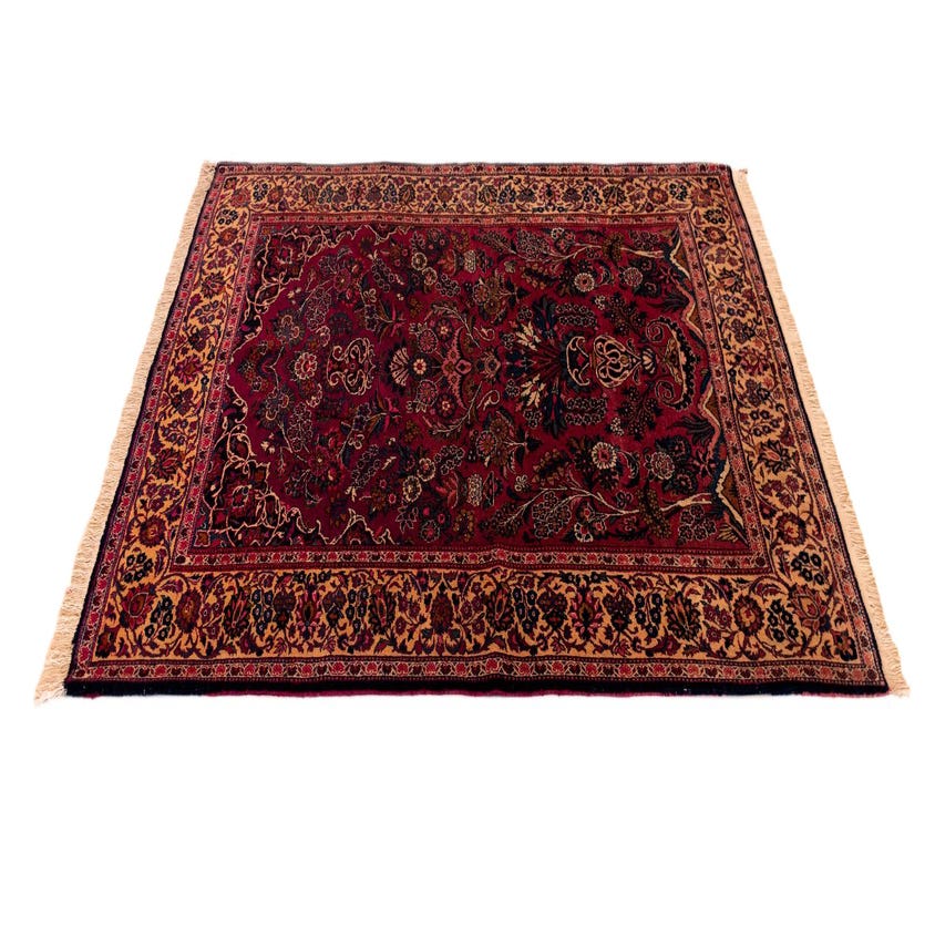 A 4x6 rectangular red Persian wool rug with intricate floral and medallion patterns in shades of red, blue, and gold.