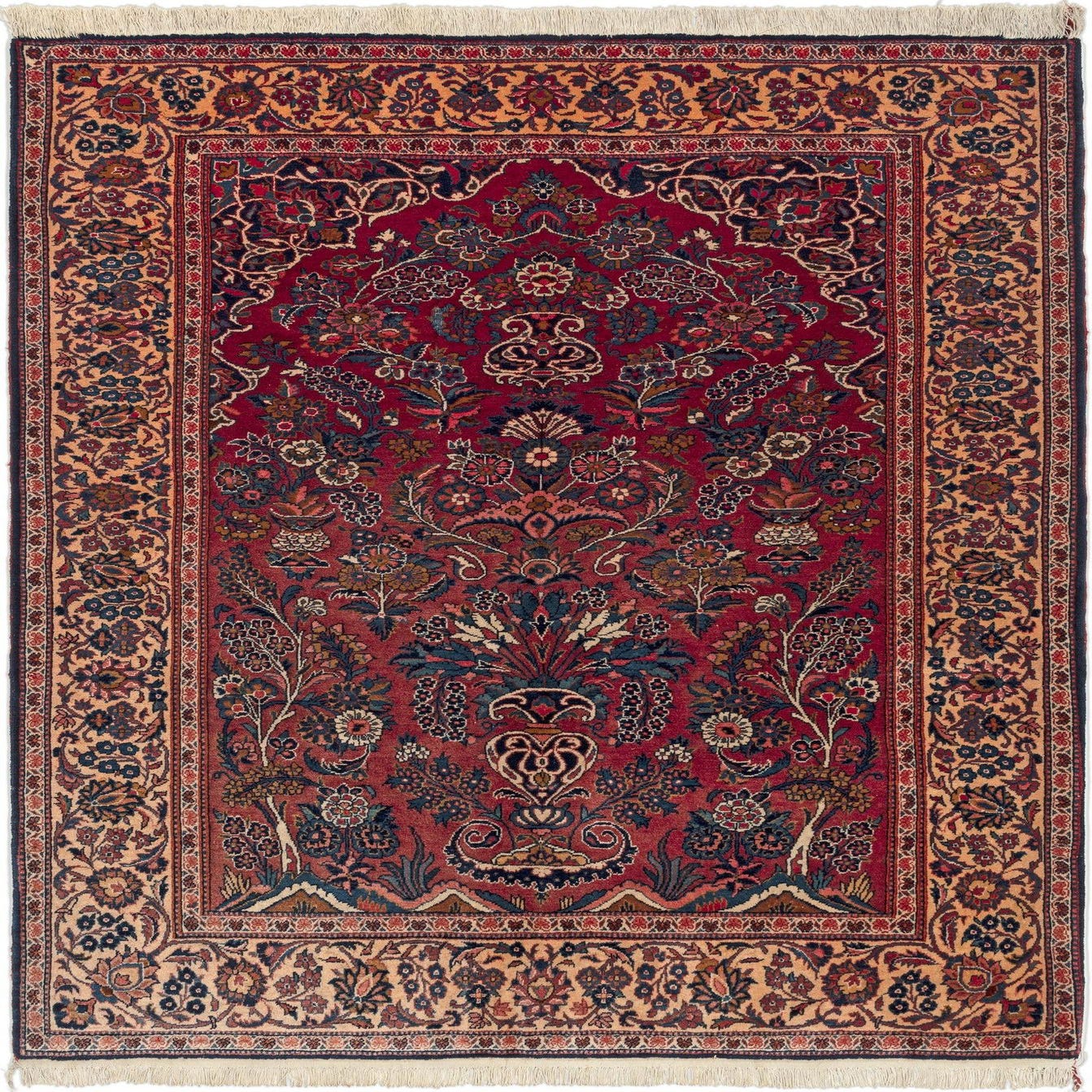 Handmade of 100% wool, this rug has a plush yet structured pile that feels warm and slightly velvety underfoot. A rich red field forms the backdrop for an intricate, traditional floral composition: a central vase motif rises amid scrolling vines, palmettes and sprigs rendered in navy, ivory, rust and muted gold. A warm ivory border with repeating floral arabesques frames the design, and the handwoven construction produces fine detail and subtle tonal variations that give the surface depth and texture.