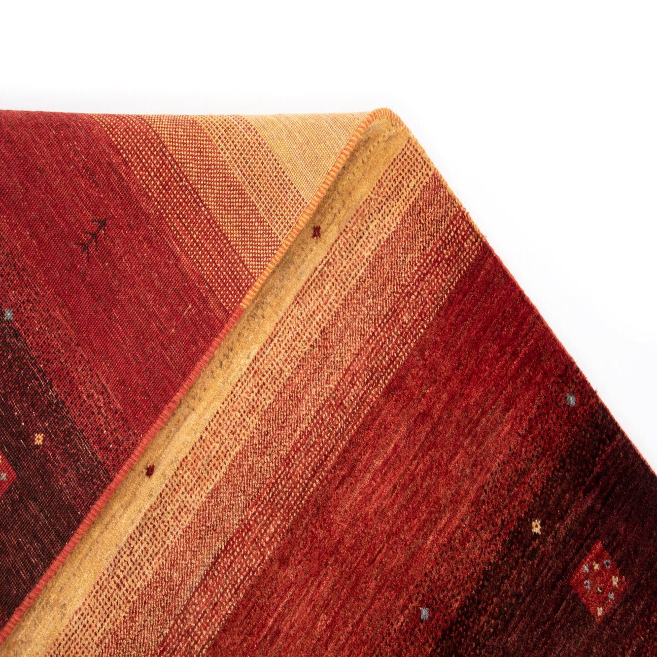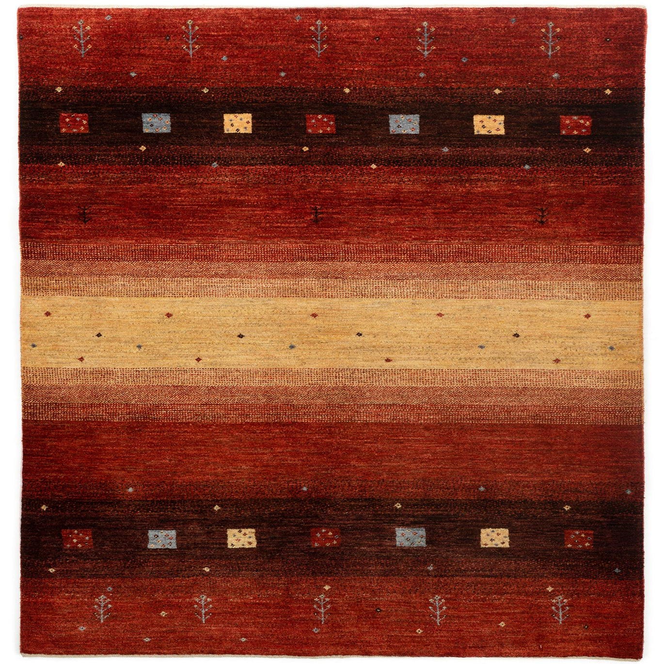 A 4x6 rectangular Persian rug featuring rich reds, brown, and gold stripes with small geometric and tree-like patterns.