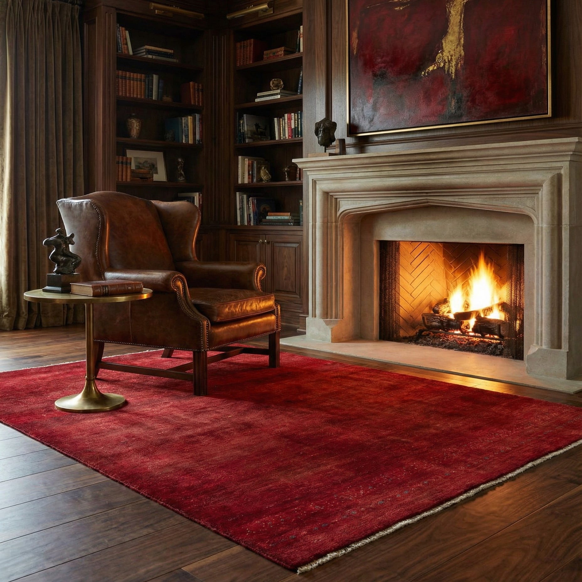 The deep red hue serves as a strong anchor for interiors, making it an ideal choice for spaces that require a touch of sophistication and a dash of color. The subtle blue accents add depth and interest without overwhelming the piece's overall simplicity and elegance. Given its color palette and design, this rug would complement a variety of decor styles, including modern, bohemian, or traditional settings. It can seamlessly integrate into a living room under a coffee table, as a statement piece in a dining area, or it can lend a welcoming atmosphere to an entryway.