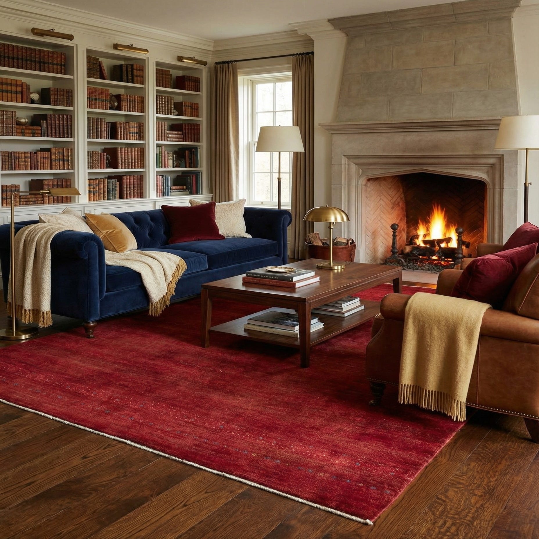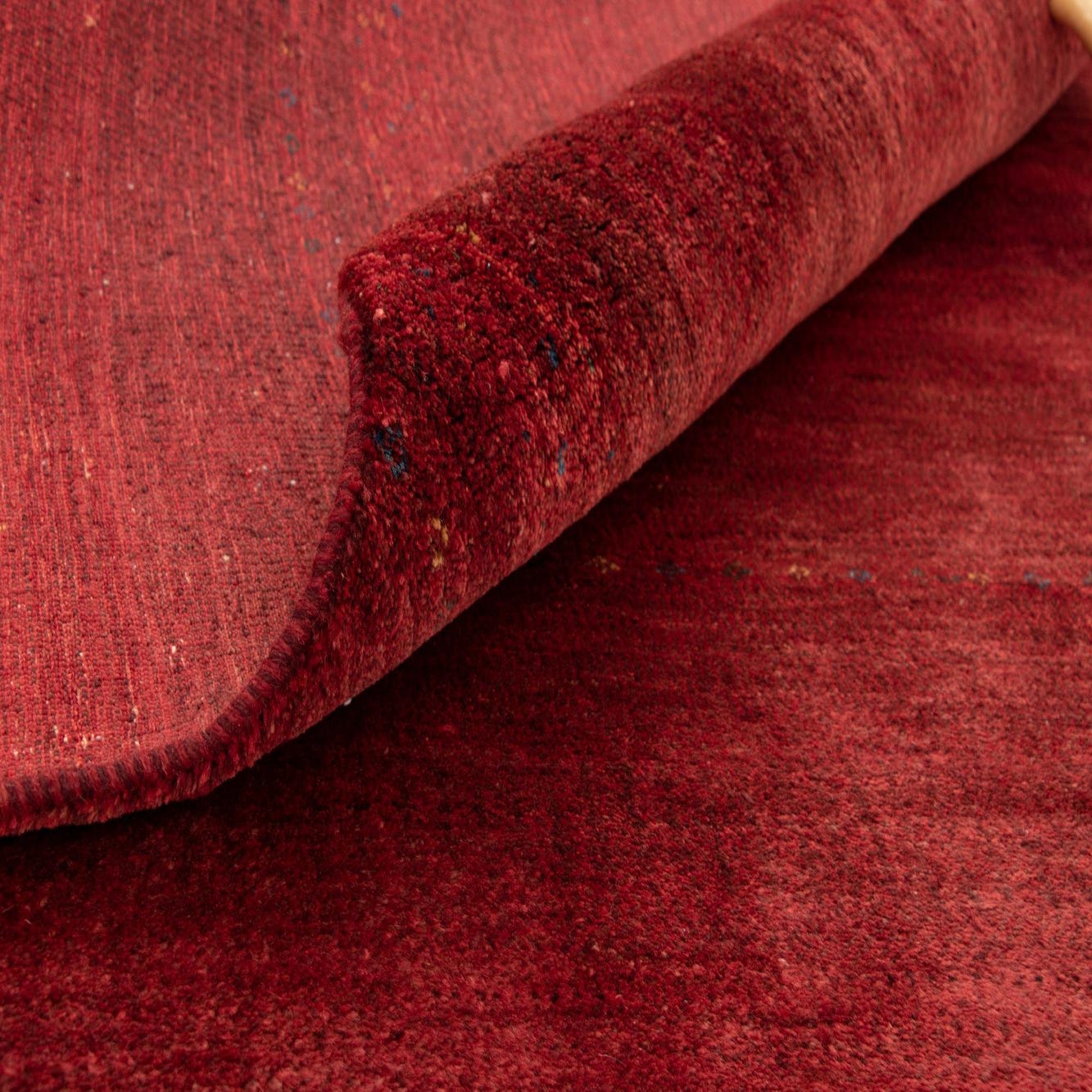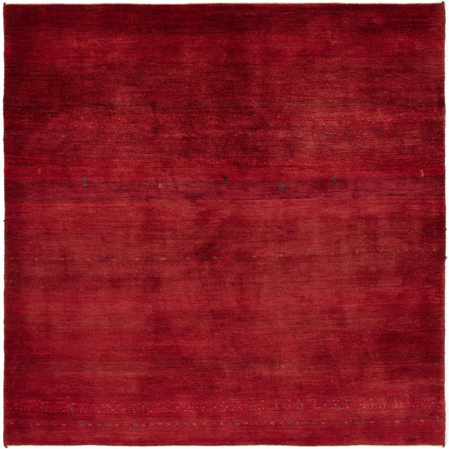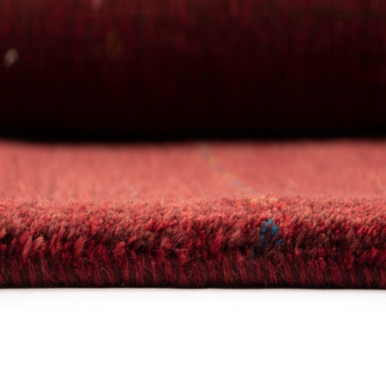 The deep red hue serves as a strong anchor for interiors, making it an ideal choice for spaces that require a touch of sophistication and a dash of color. The subtle blue accents add depth and interest without overwhelming the piece's overall simplicity and elegance. Given its color palette and design, this rug would complement a variety of decor styles, including modern, bohemian, or traditional settings. It can seamlessly integrate into a living room under a coffee table, as a statement piece in a dining area, or it can lend a welcoming atmosphere to an entryway.