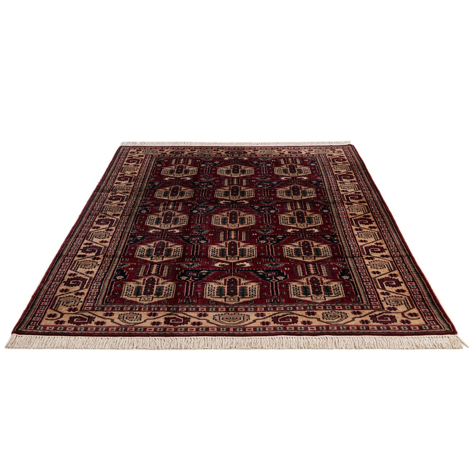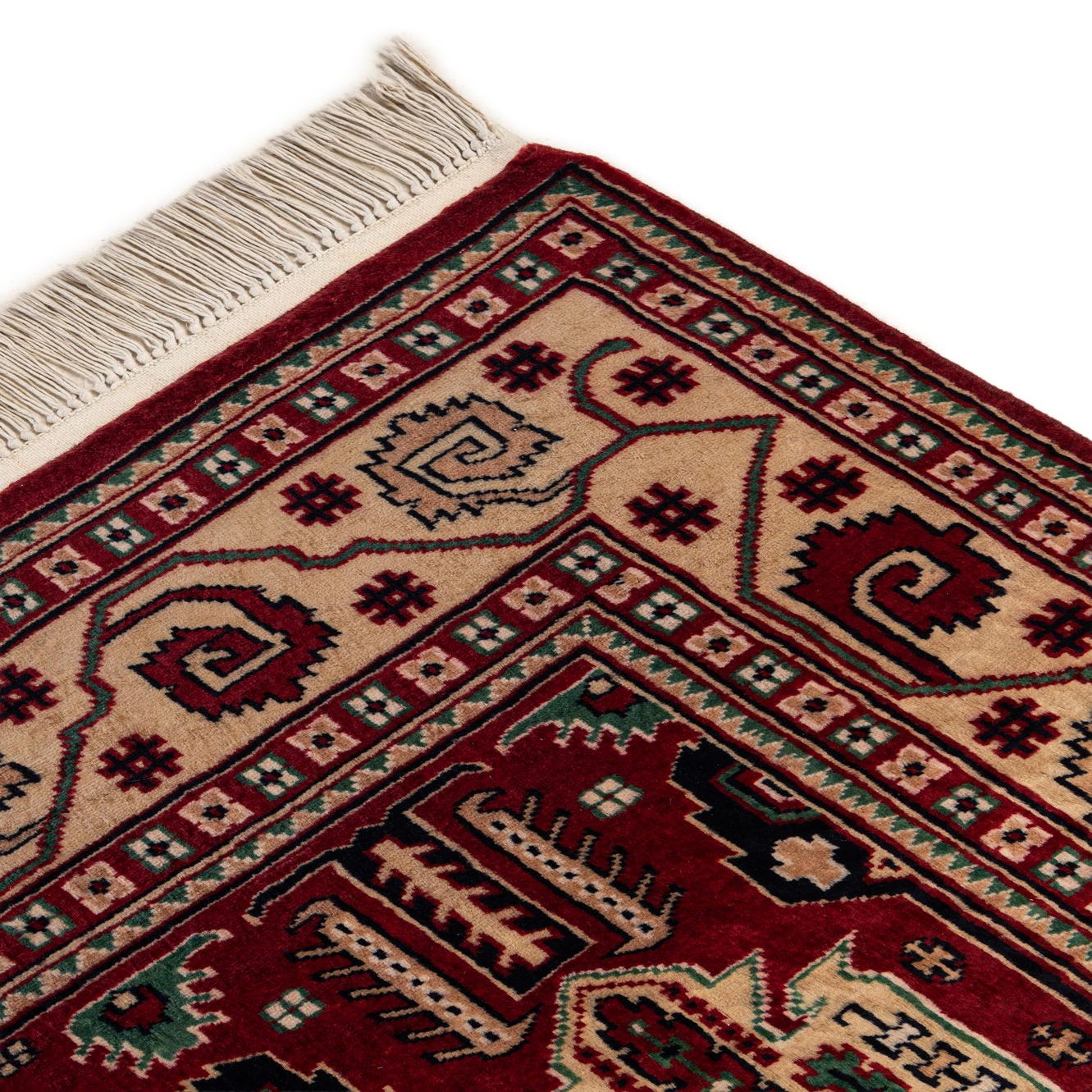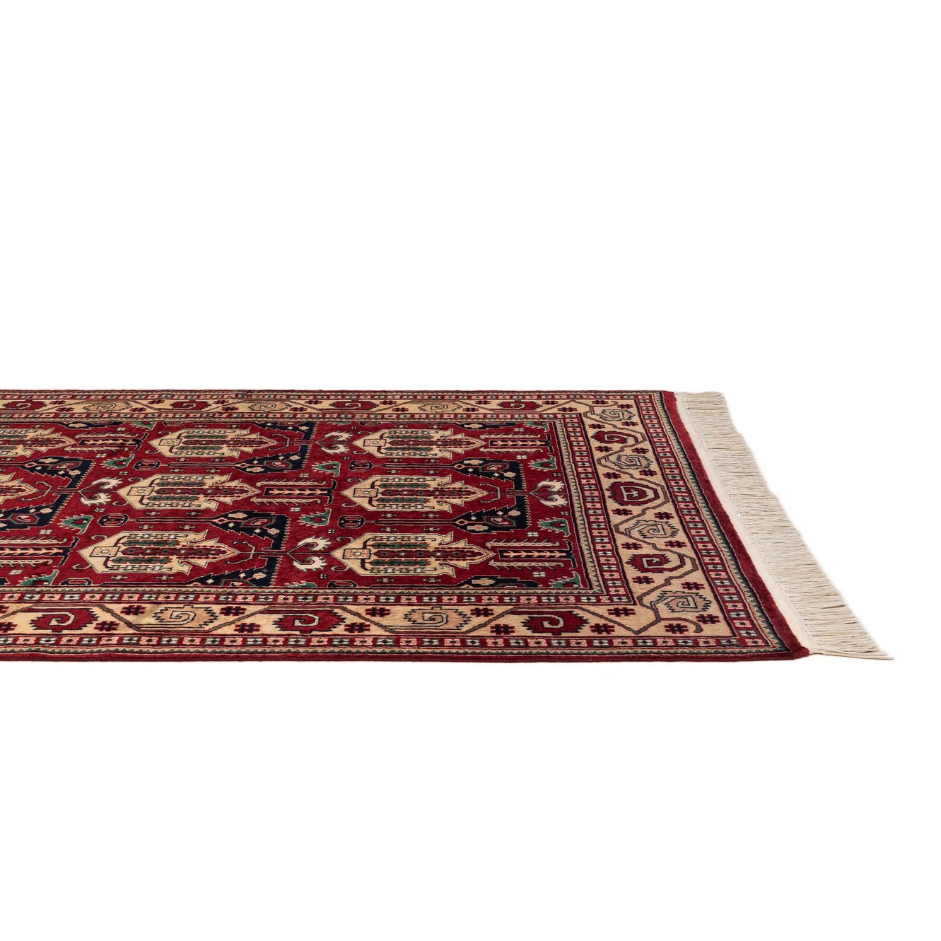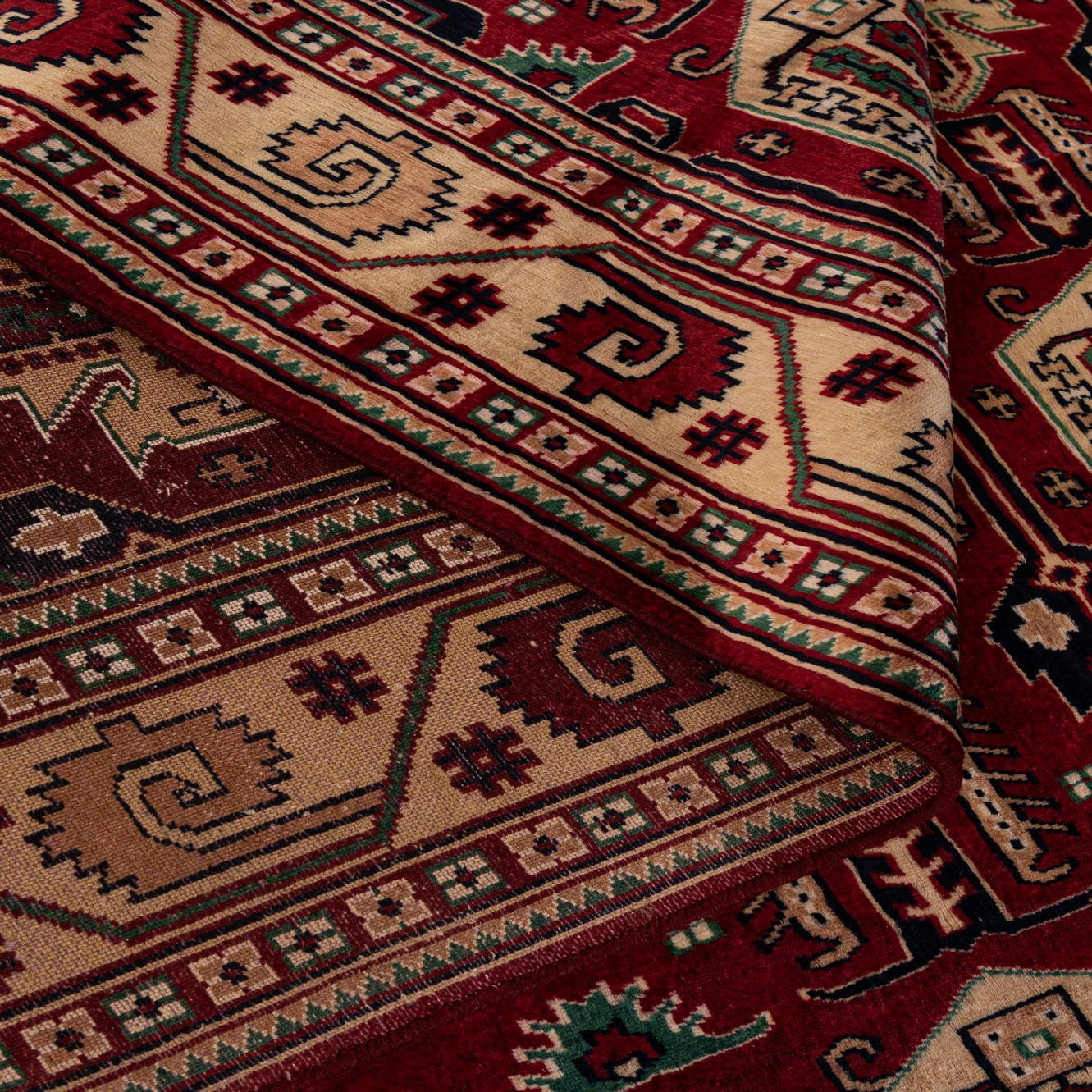 Primary color is Red. Colors in this rug include: Red, Beige, Brown, Navy Blue, Green.