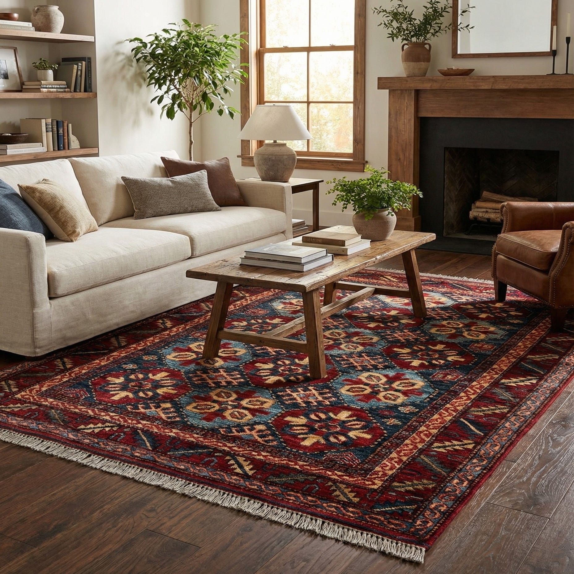 This piece pairs naturally with warm wood furniture, leather seating, and metal accents in brass or matte black for a layered, collected look. It anchors a compact seating area or reading nook, sits comfortably at the foot of a bed, or defines space beneath a small coffee table—bringing traditional pattern and rich color to transitional, rustic, or eclectic interiors.