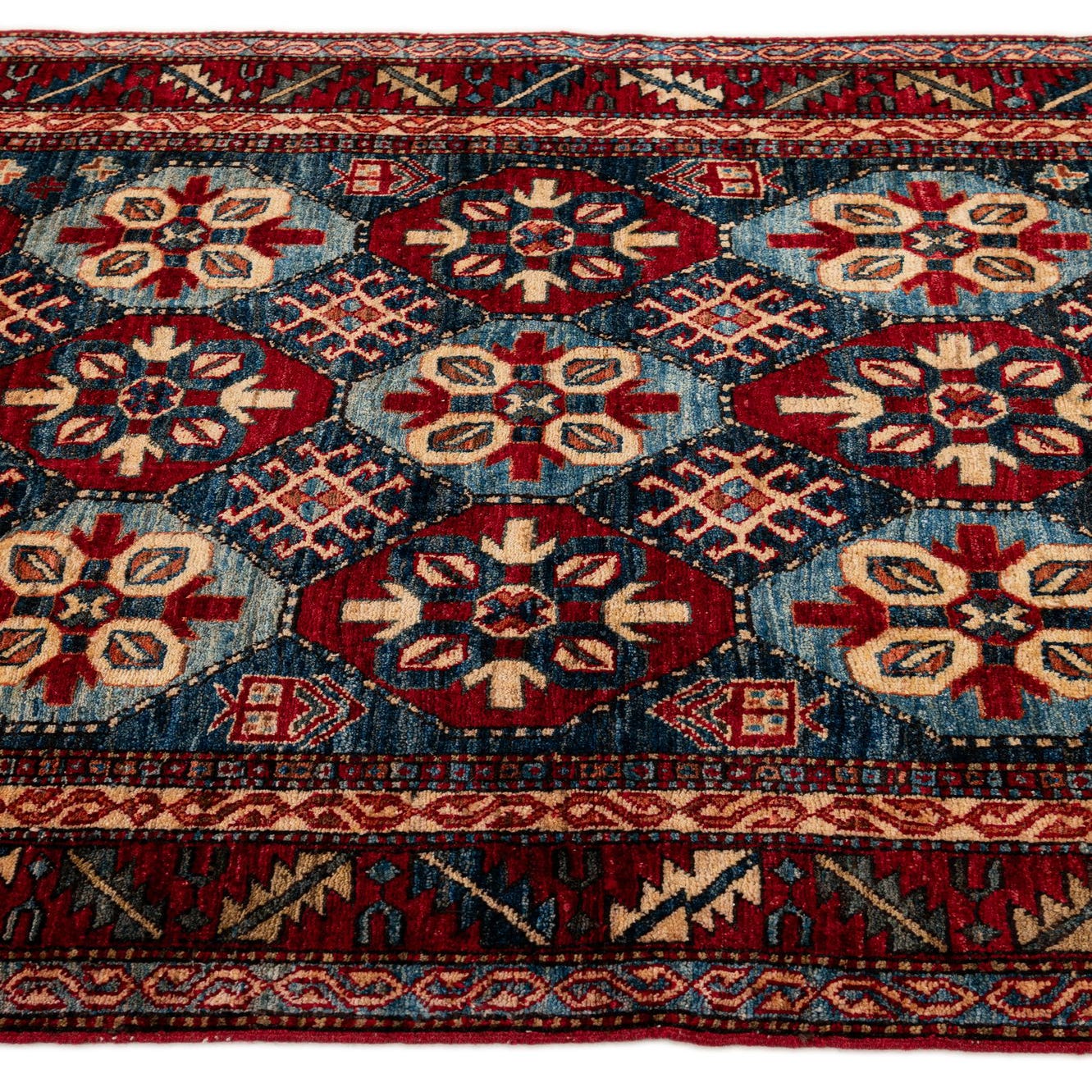 A rich red ground sets a warm backdrop for a repeating grid of octagonal medallions in alternating deep red and light blue, each centered with a stylized floral-star motif in beige and brown. Small lattice motifs and hooked accents in black and various blues fill the field between medallions, while layered guard borders with stepped geometric patterns frame the composition. The ends finish with natural knotted fringes. Hand-knotted from 100% wool, the rug has a dense, low-to-medium pile that feels firm underfoot with a soft wool nap that brings out the subtle color depth.