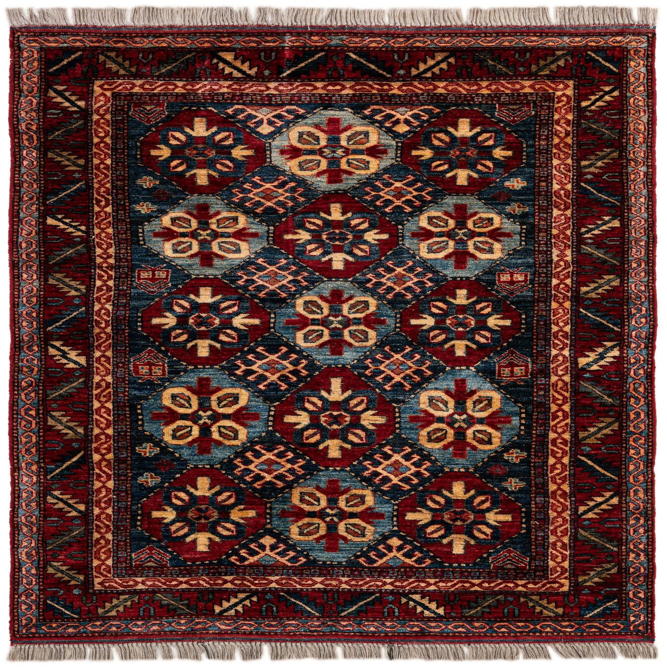 Primary color is Red. Colors in this rug include: Red, Black, Blue, Brown, Light Blue.