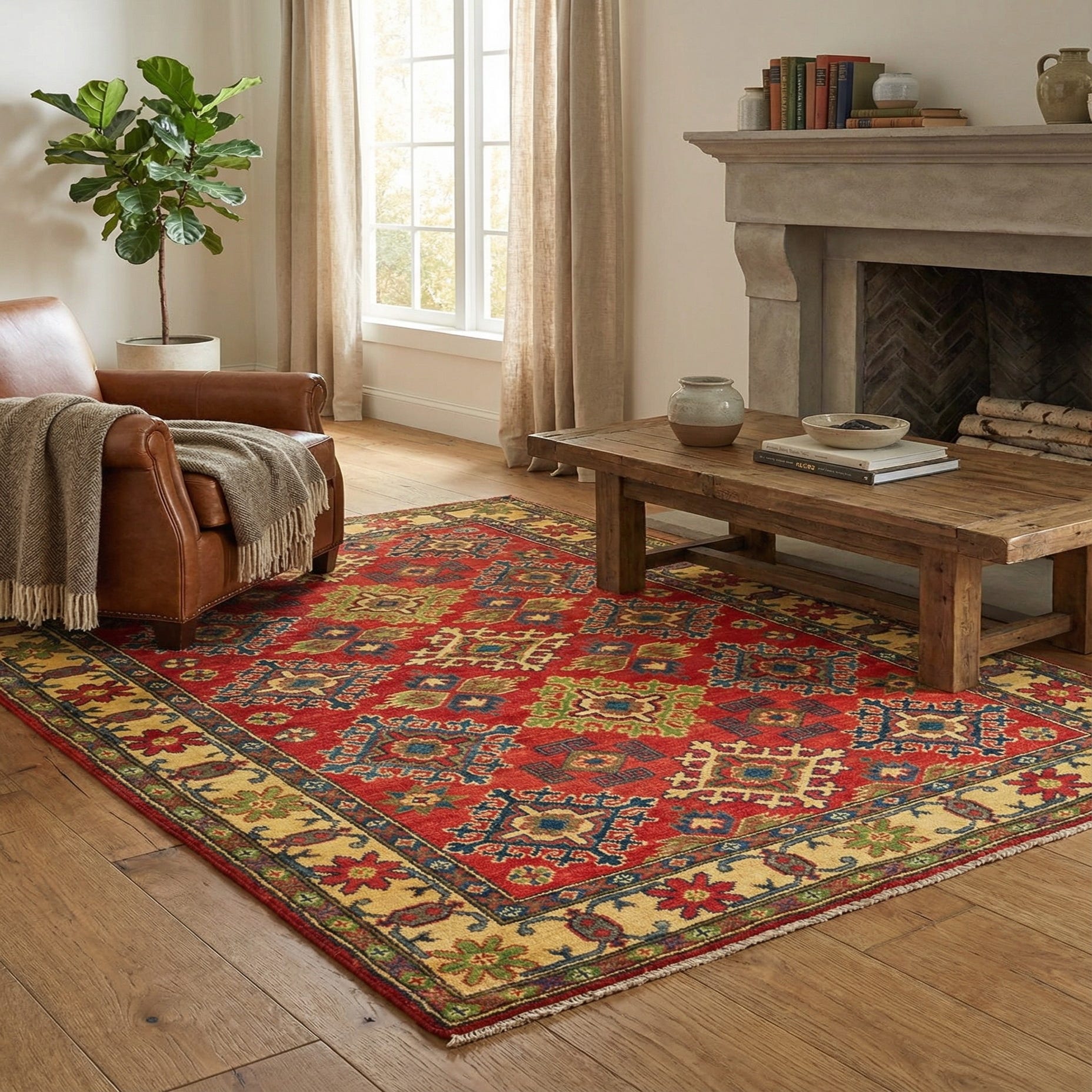 The Kazak collection offers a 4x6 hand-knotted rug crafted from 100% hand-spun wool, providing a durable and tactile appeal. This rug features a striking red background, complemented by an array of rich colors including black, blue, brown, cream, green, light blue, light green, and navy blue. Traditional geometric patterns and symbolic motifs are intricately woven throughout the design, giving this piece a sense of timelessness and sophistication. Framed by an ornate border, the design is both balanced and engaging.