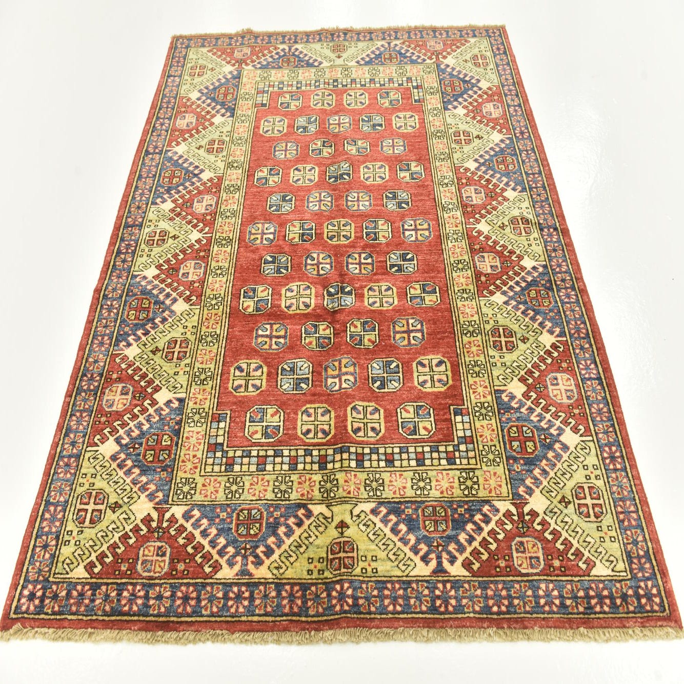 A 4x6 rectangular red traditional Kazak rug with intricate tribal patterns in blue, green, and beige.