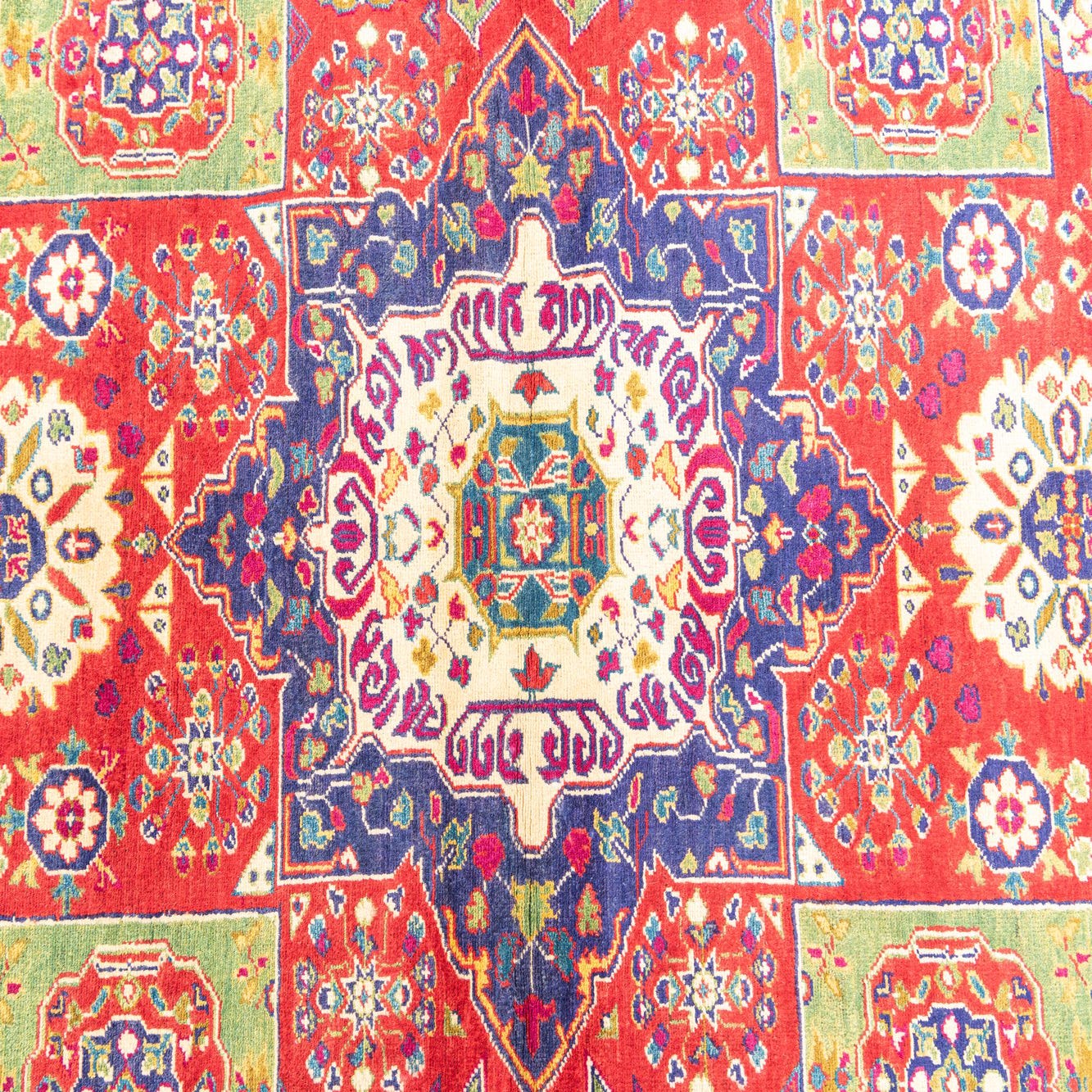 The Kazak Collection presents a hand-knotted 4x6 rug, diligently crafted from 100% hand-spun wool, delivering a texture that offers both durability and comfort underfoot. This rug showcases a robust red background, layered with intricate patterns in a dynamic palette including blue, brown, cream, green, navy blue, and ivory. The traditional motifs feature a harmonious balance of geometrical medallions and botanical designs that evoke a sense of time-honored craftsmanship.