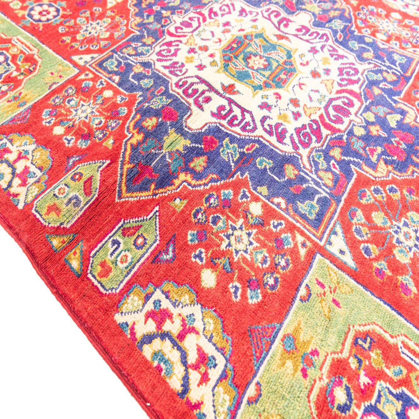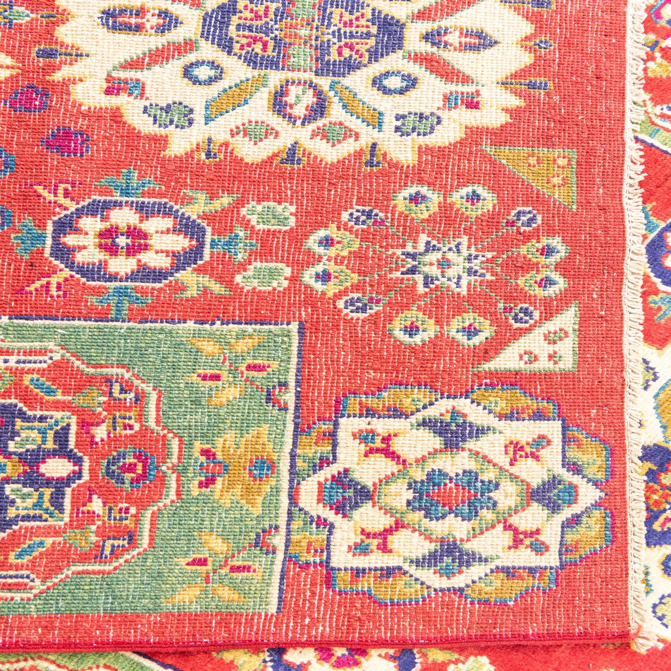 Primary color is Red. Colors in this rug include: Red, Blue, Brown, Cream, Green, Navy Blue, Ivory.