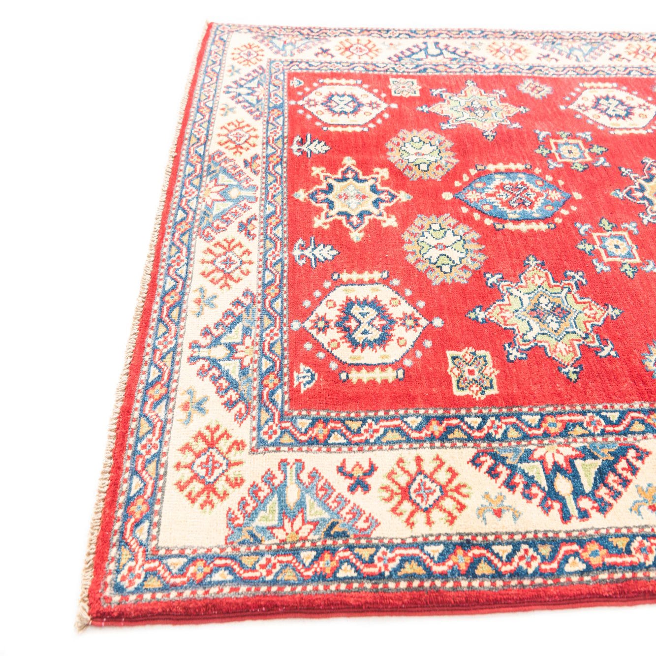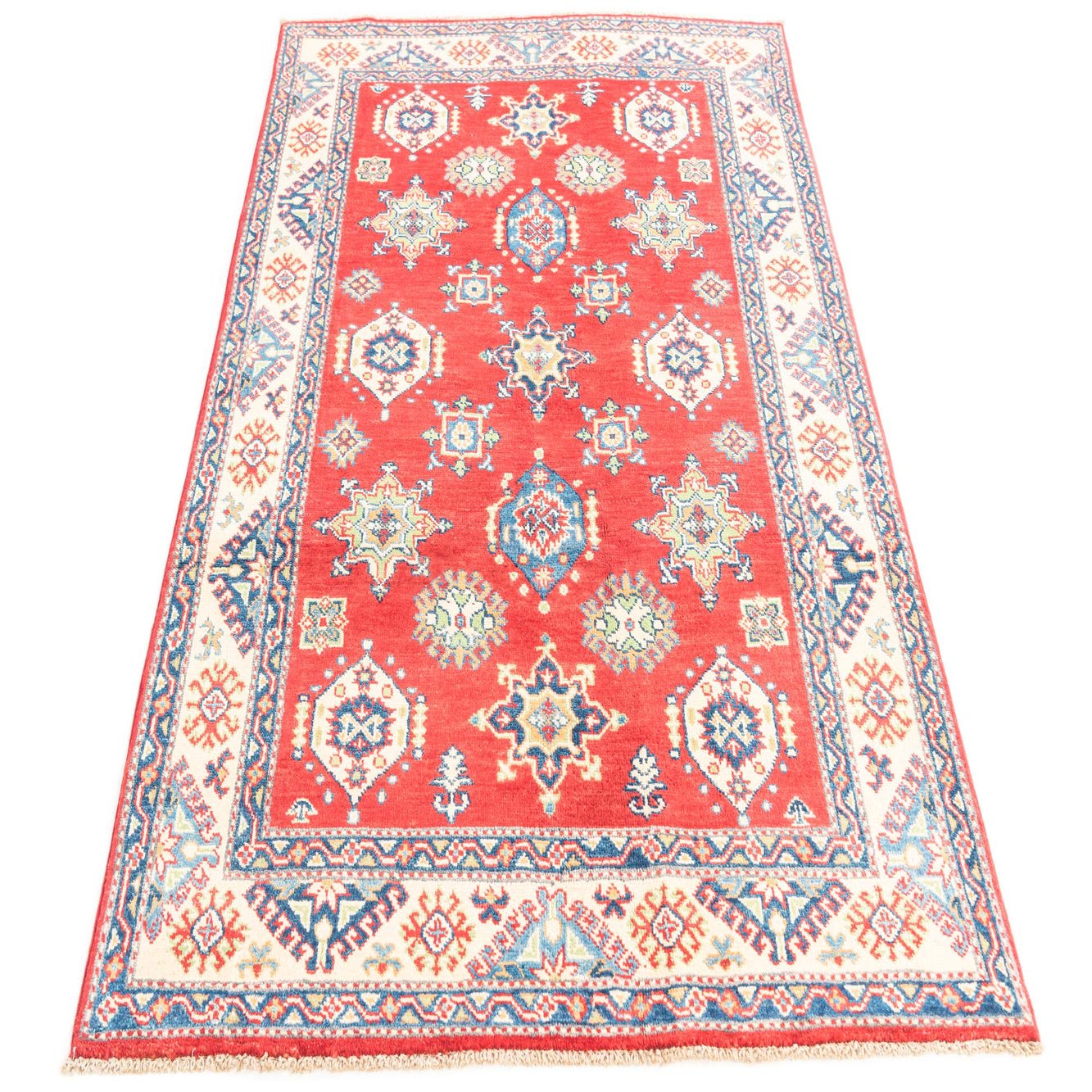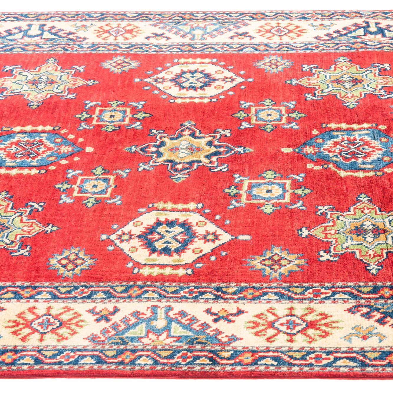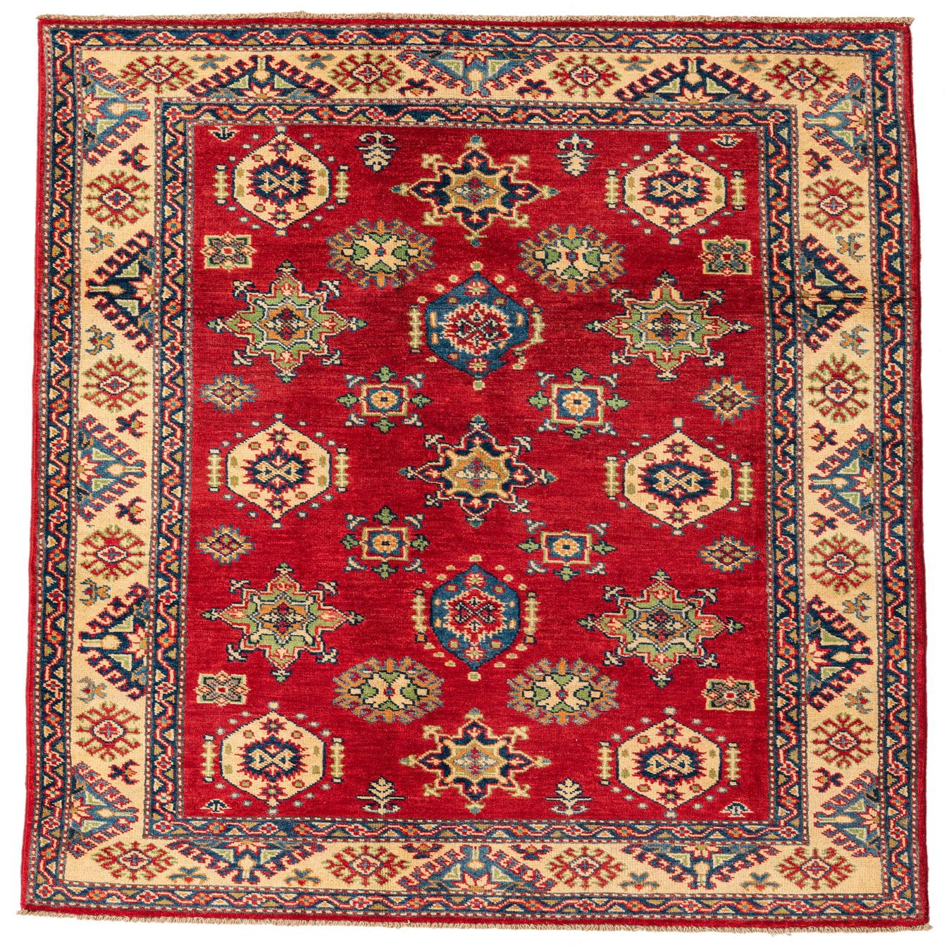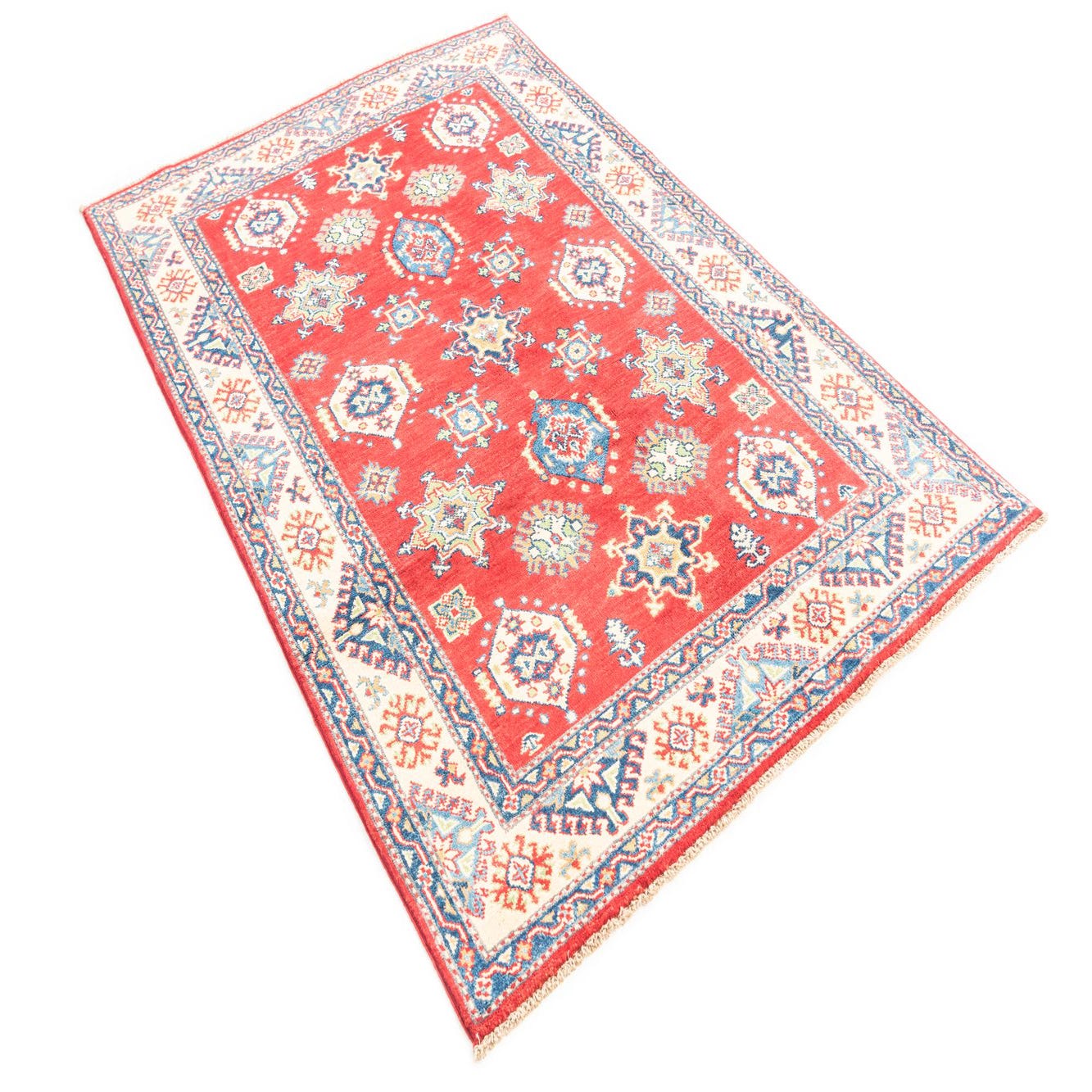 A 4x6 rectangular red traditional Kazak rug with intricate Southwestern and Oriental patterns in blue, gold, and green.