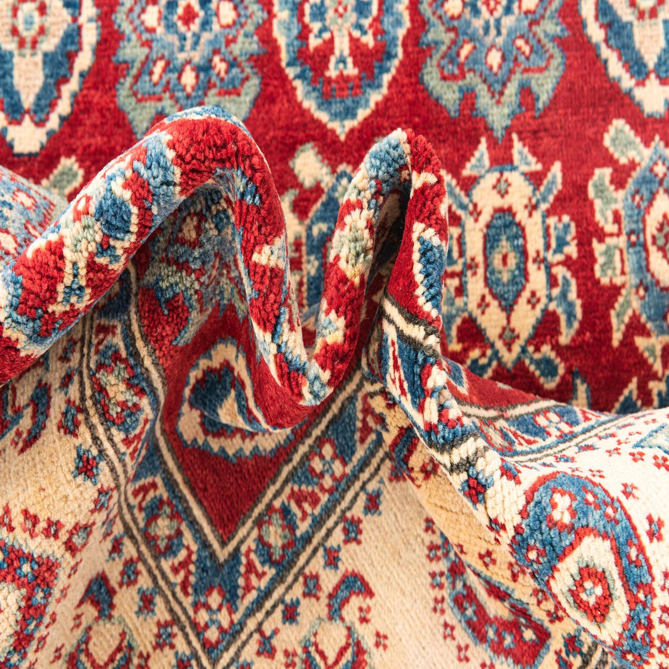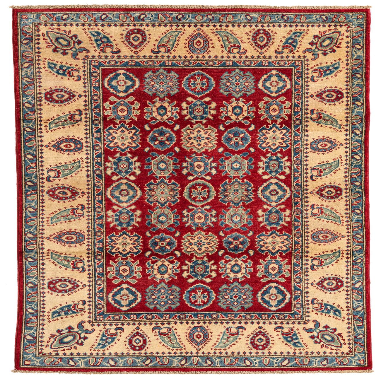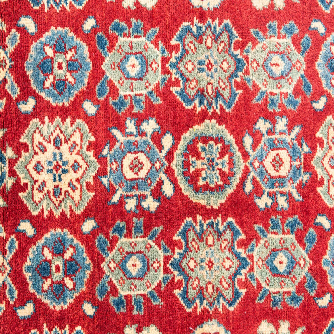 The Kazak Collection hand-knotted rug boasts a vibrant red background, setting the stage for a bold and dynamic traditional design. Intricate geometric motifs, including stylized floral and tribal elements, populate the field in a symphony of navy blue, cream, green, and brown, accented with touches of blue for a color palette that commands attention. Each pattern is well-defined, owing to the high-quality hand-spun wool construction, which also imparts a plush texture that invites touch.