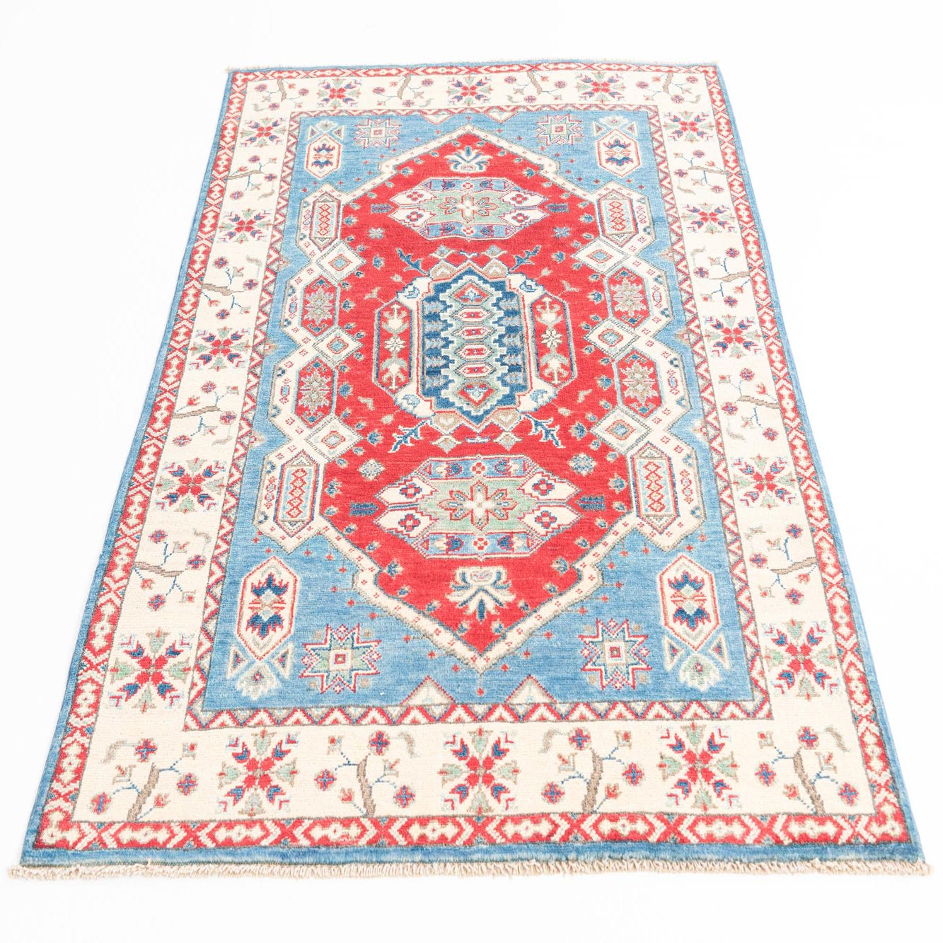 A 4x6 rectangular Rugs.com Kazak rug featuring a bold red medallion and intricate blue and cream traditional patterns.