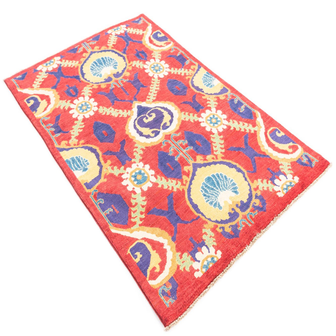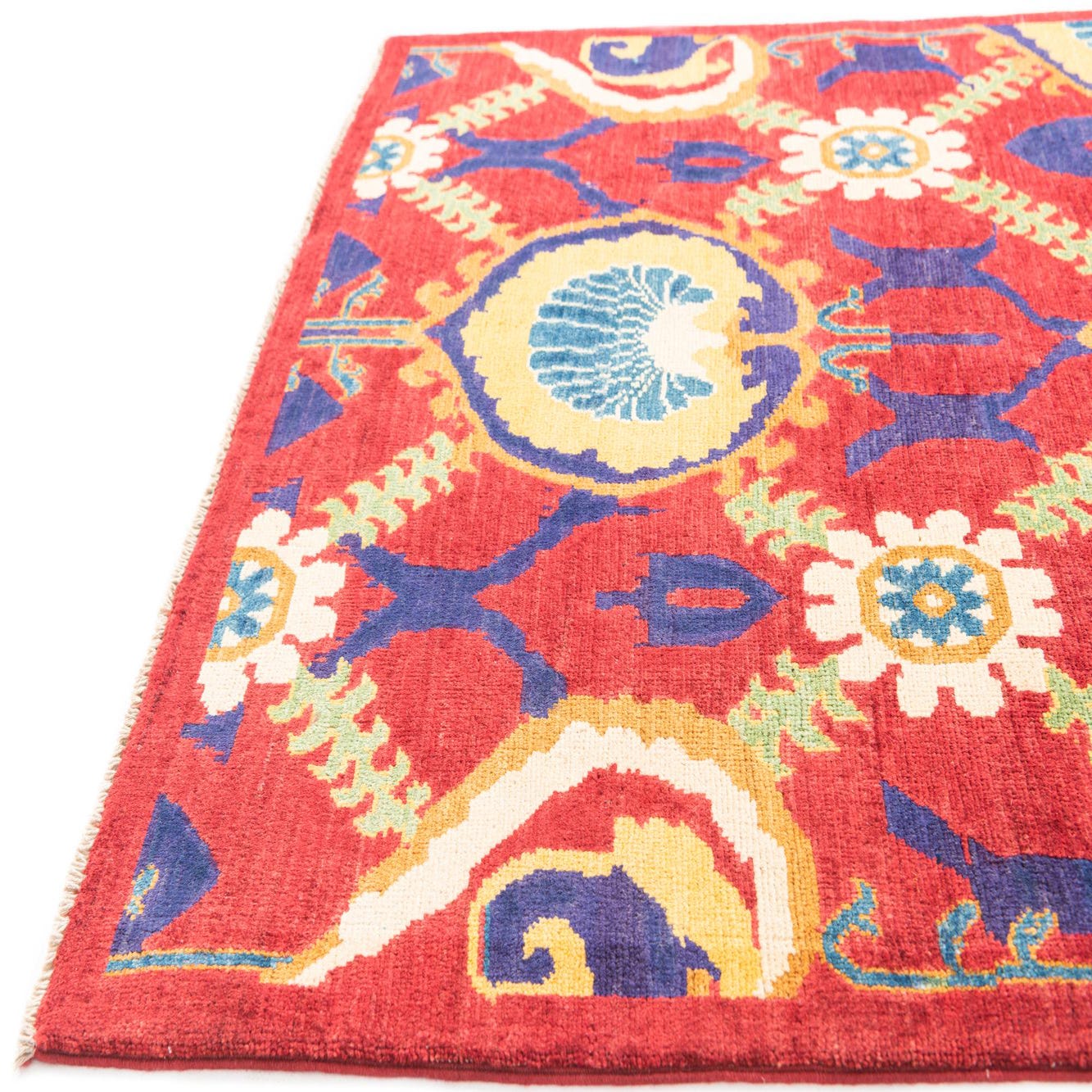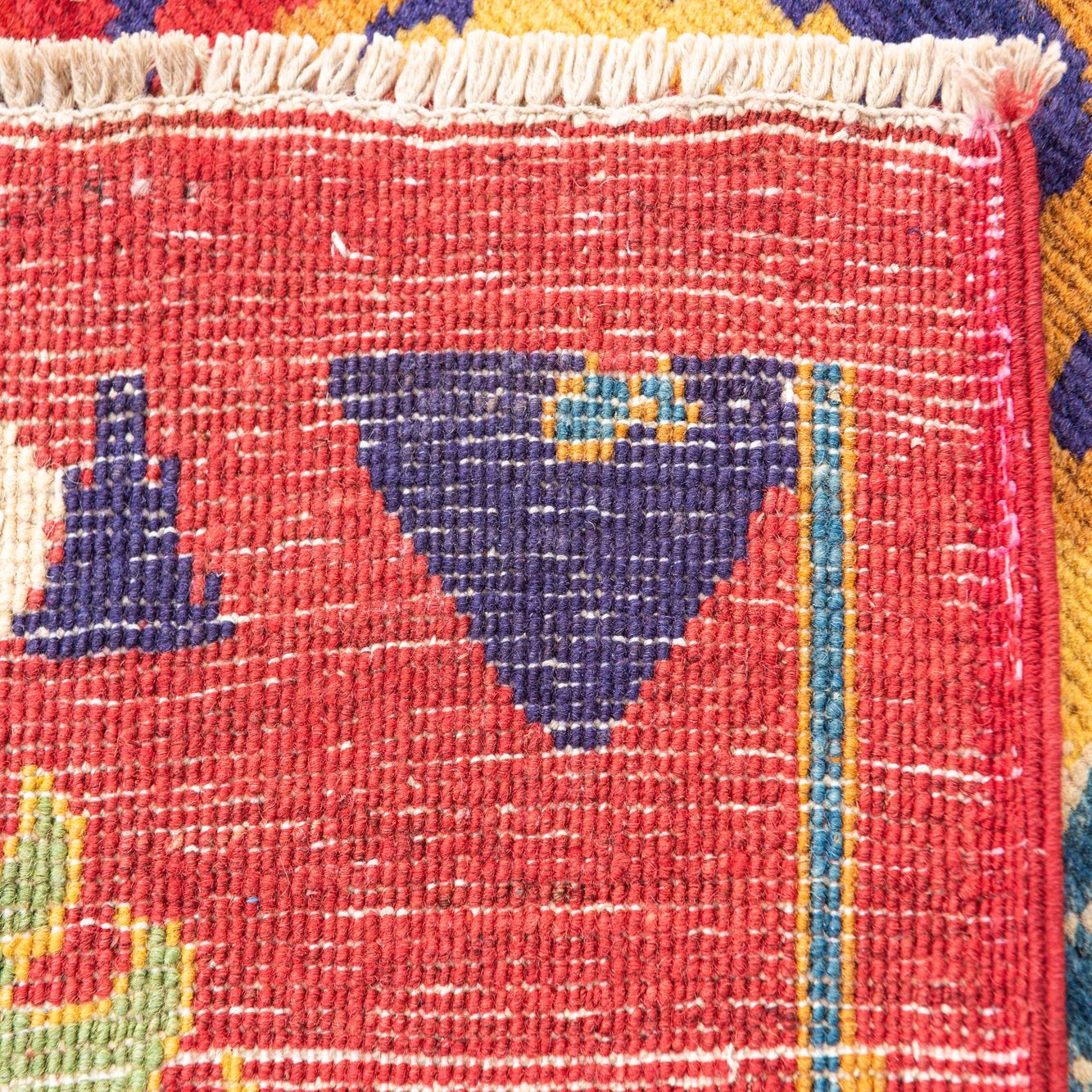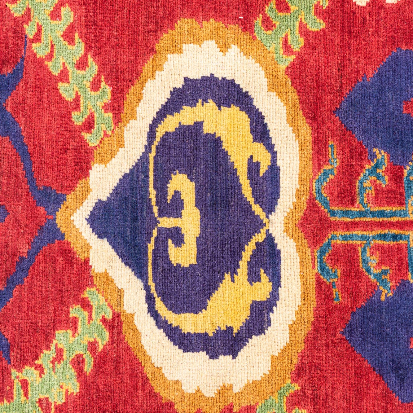 Primary color is Red. Colors in this rug include: Red, Ivory, Navy Blue, Yellow, Green.