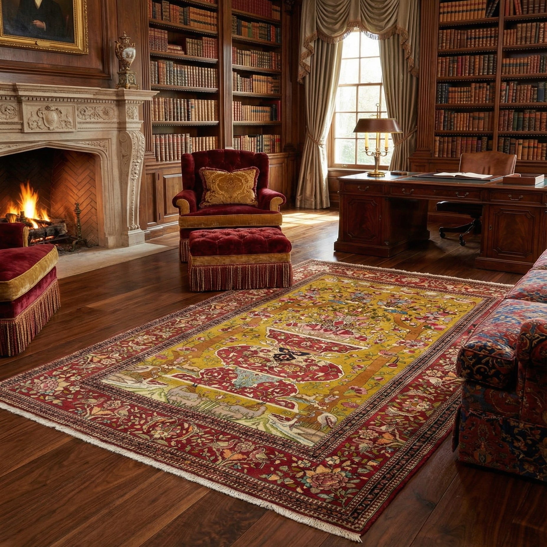 A 4x6 rectangular Kerman Persian rug with a red border and a gold field featuring a tree of life, birds, and animals.
