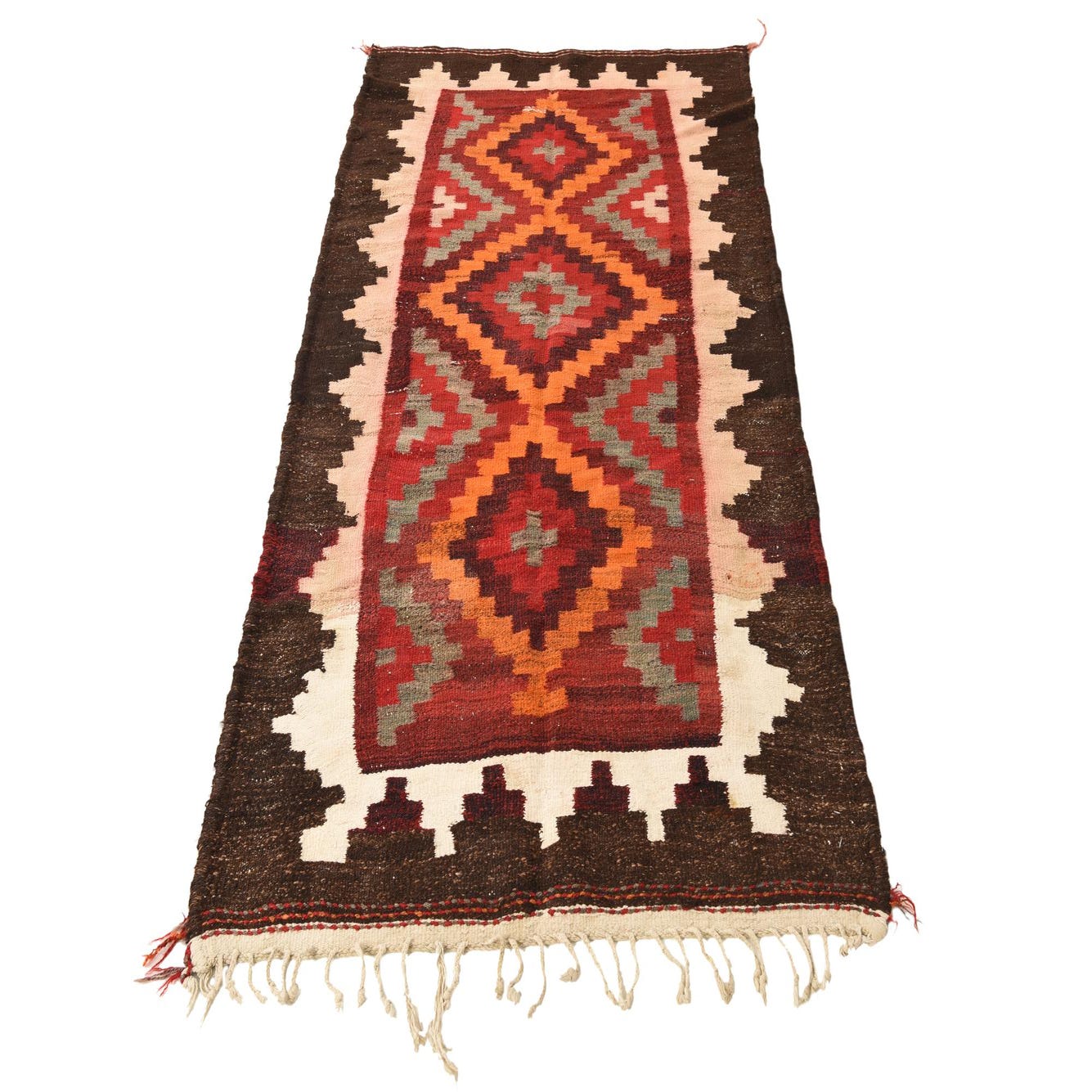 A 4x6 rectangular Kilim Fars rug with a tribal medallion pattern in reds, oranges, and grays, framed by a dark brown and cream border.