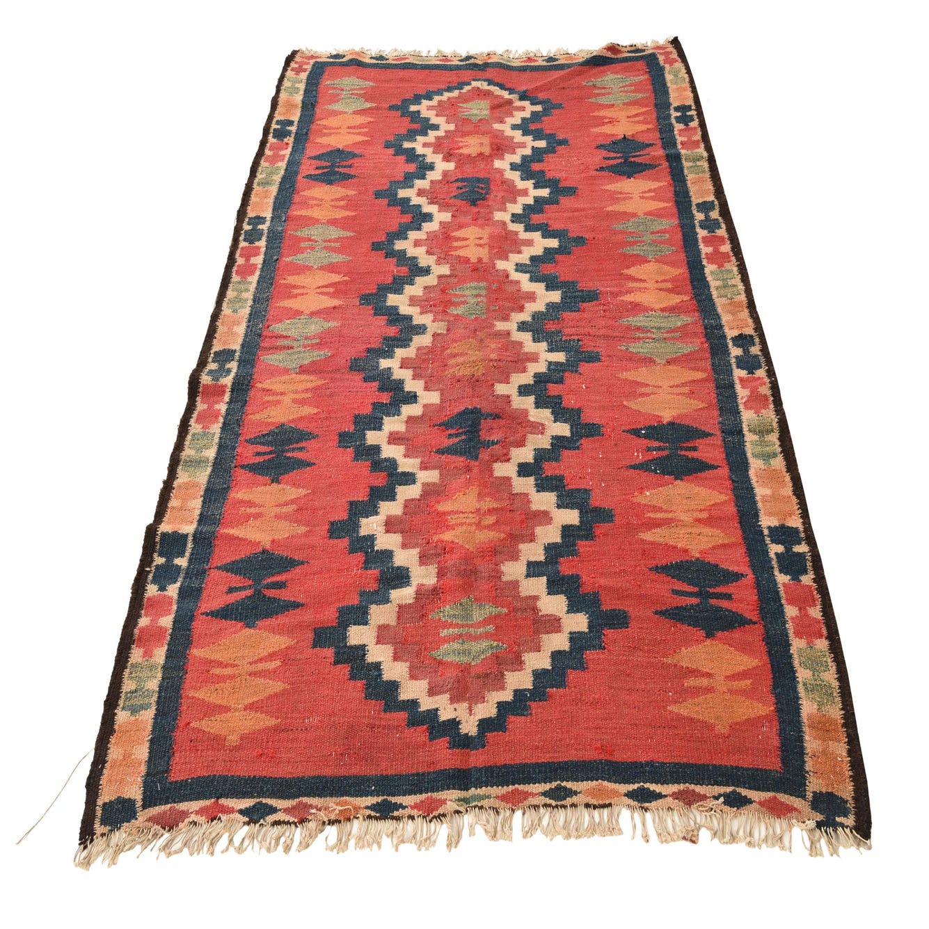 A 4x6 rectangular Kilim Fars rug with a vibrant red field and a central geometric pattern in navy, beige, and orange.