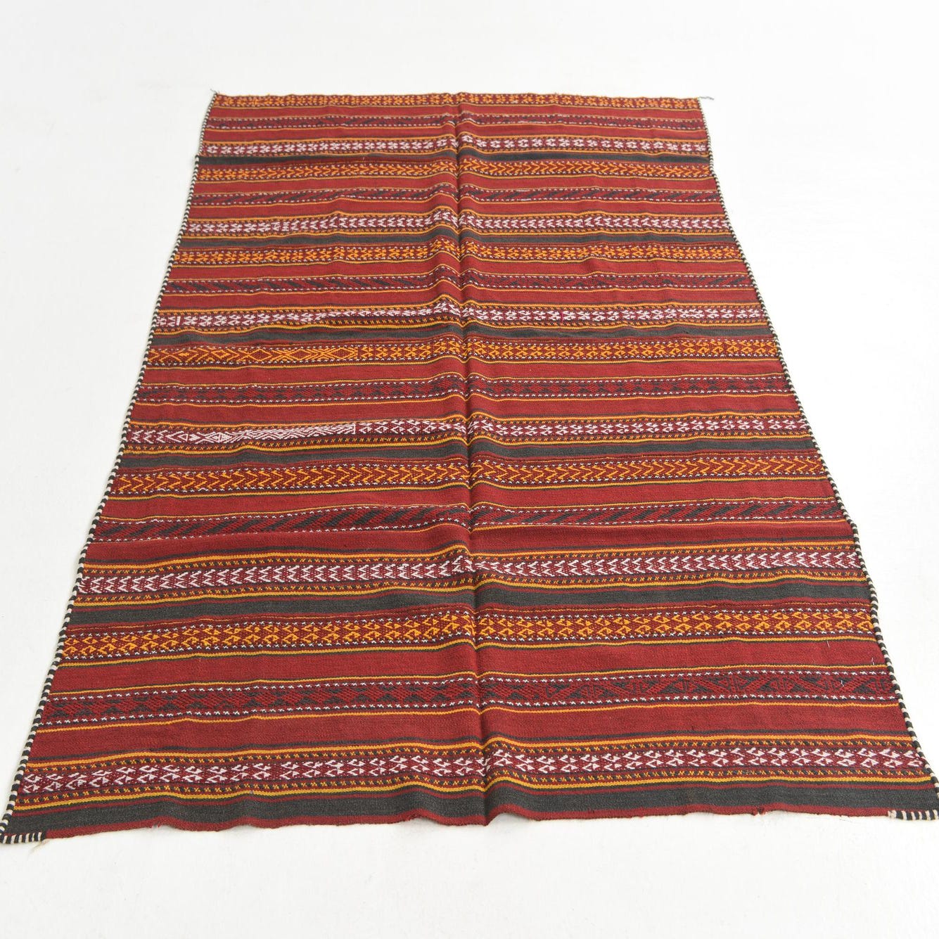 A 4x6 rectangular Kilim Fars rug with a flatweave, featuring horizontal stripes in various shades of red, accented with tribal patterns in black, white, and gold.
