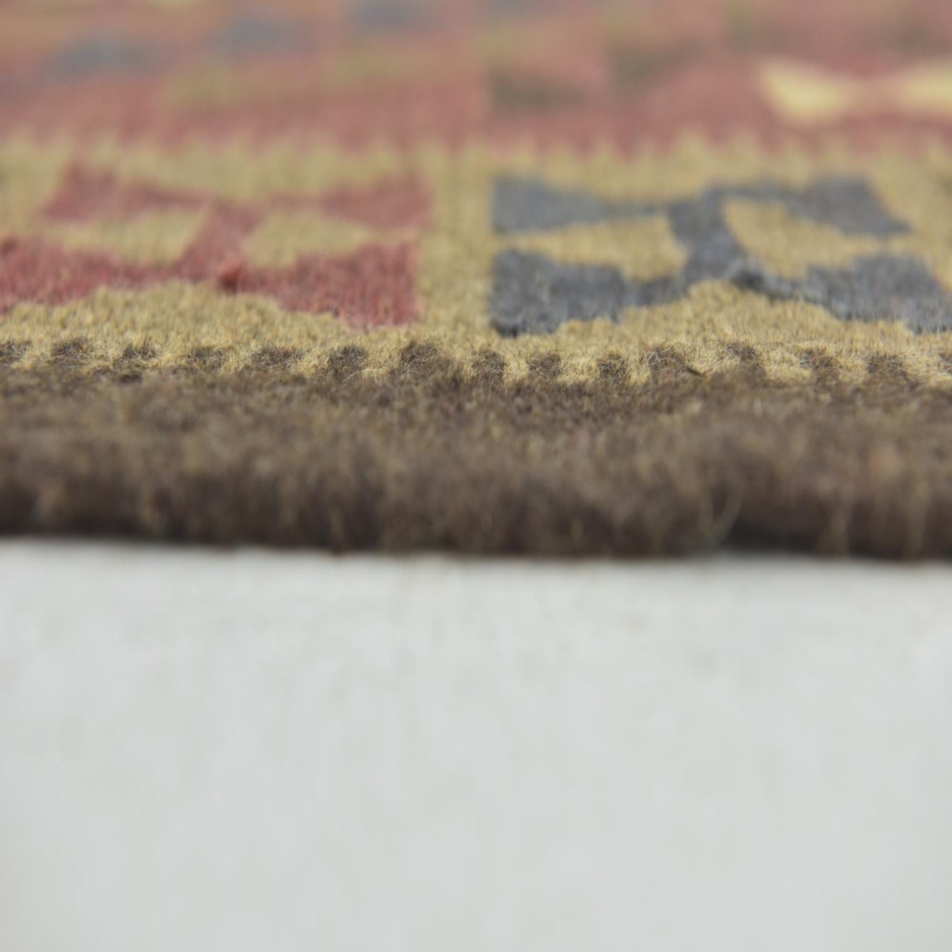 The low-profile flatweave has a firm, tactile surface with the slight tooth of natural wool—comfortable underfoot and well suited to high-traffic spots. It pairs naturally with leather seating and warm wood tones for a rustic or Southwestern look, layers nicely over a larger neutral carpet in a living room, and anchors a cozy reading nook or entryway. The pattern and palette also fit bohemian and globally inspired interiors, and can bring color and structure to a modern, minimalist space when used as a focal accent.
