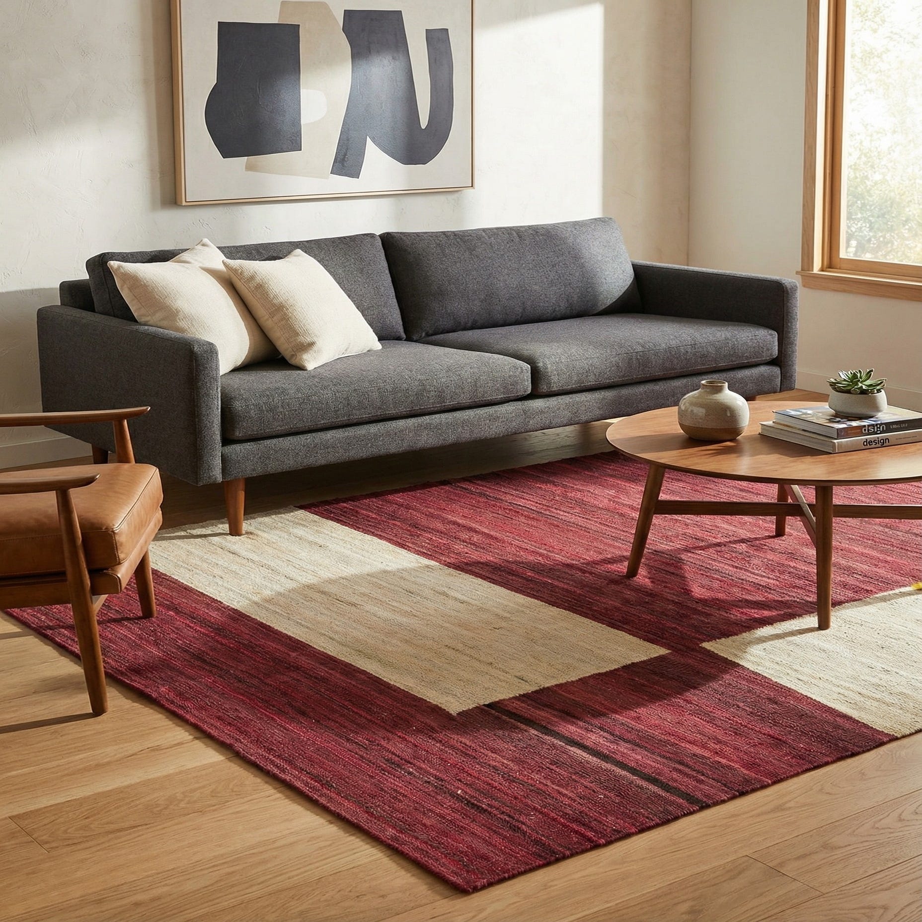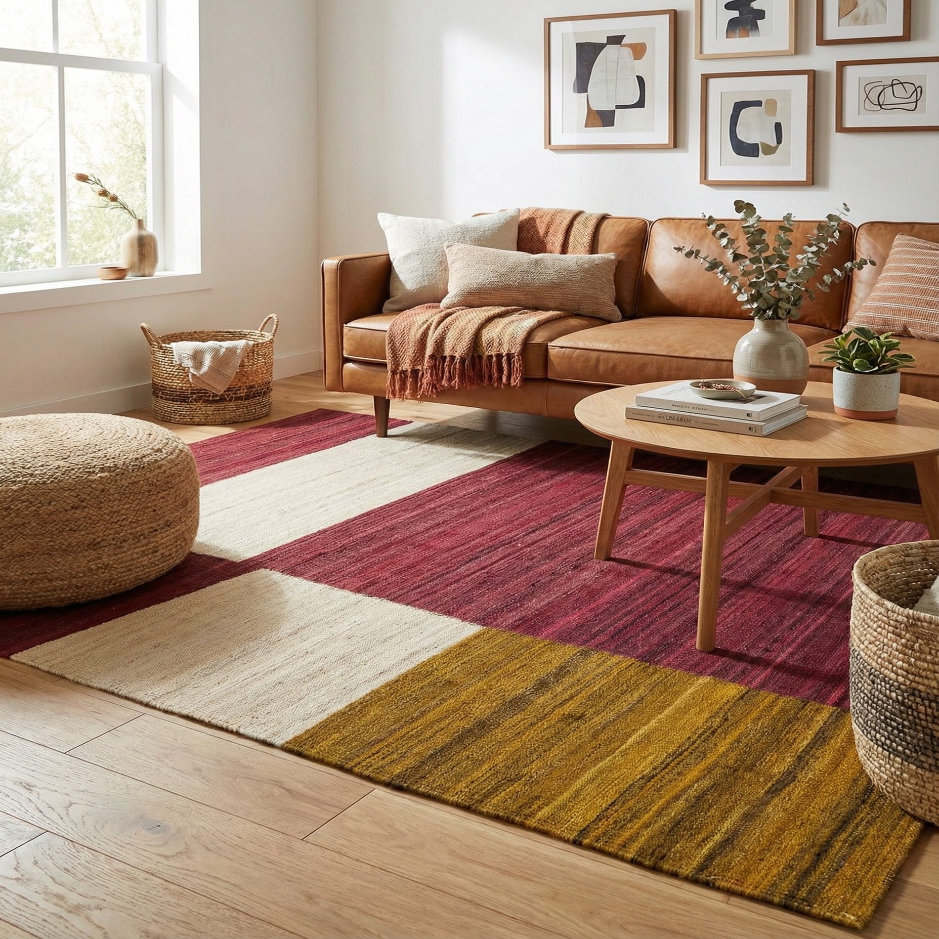 A 4x6 rectangular Kilim Modern rug with a flatweave texture, featuring a bold abstract pattern in various shades of red, cream, and a touch of gold.