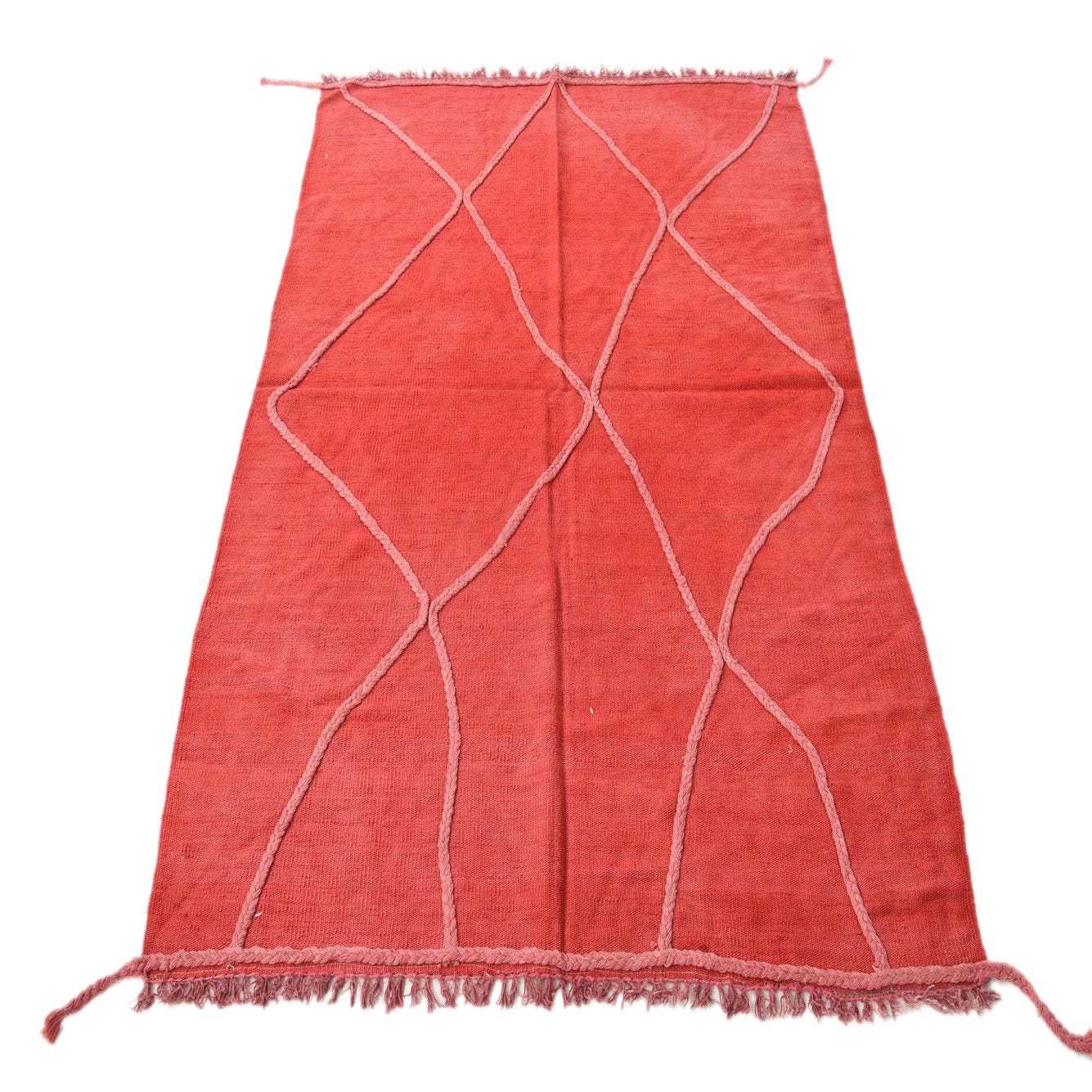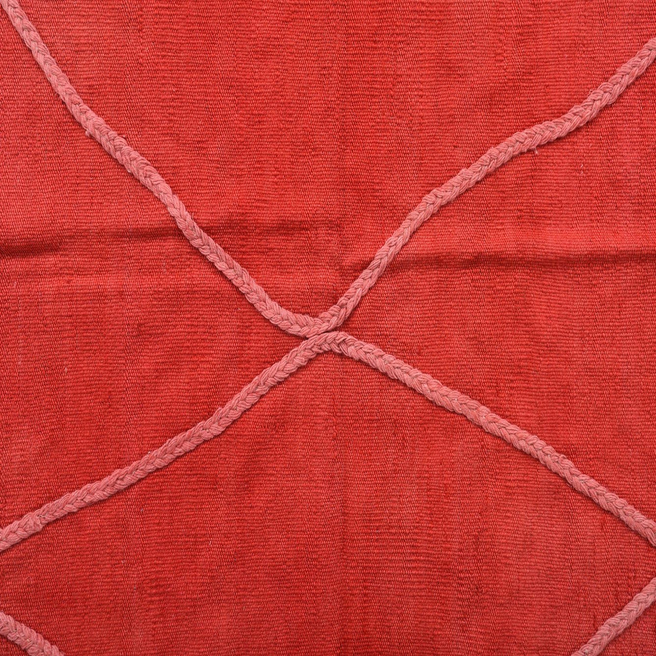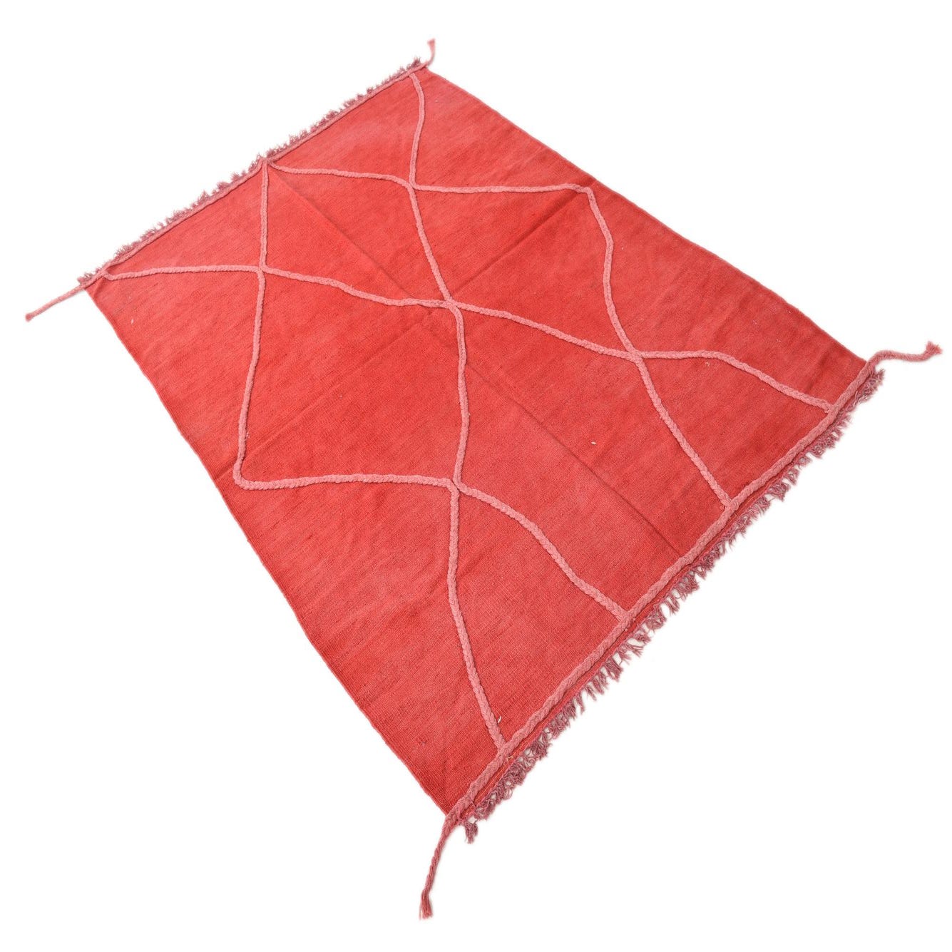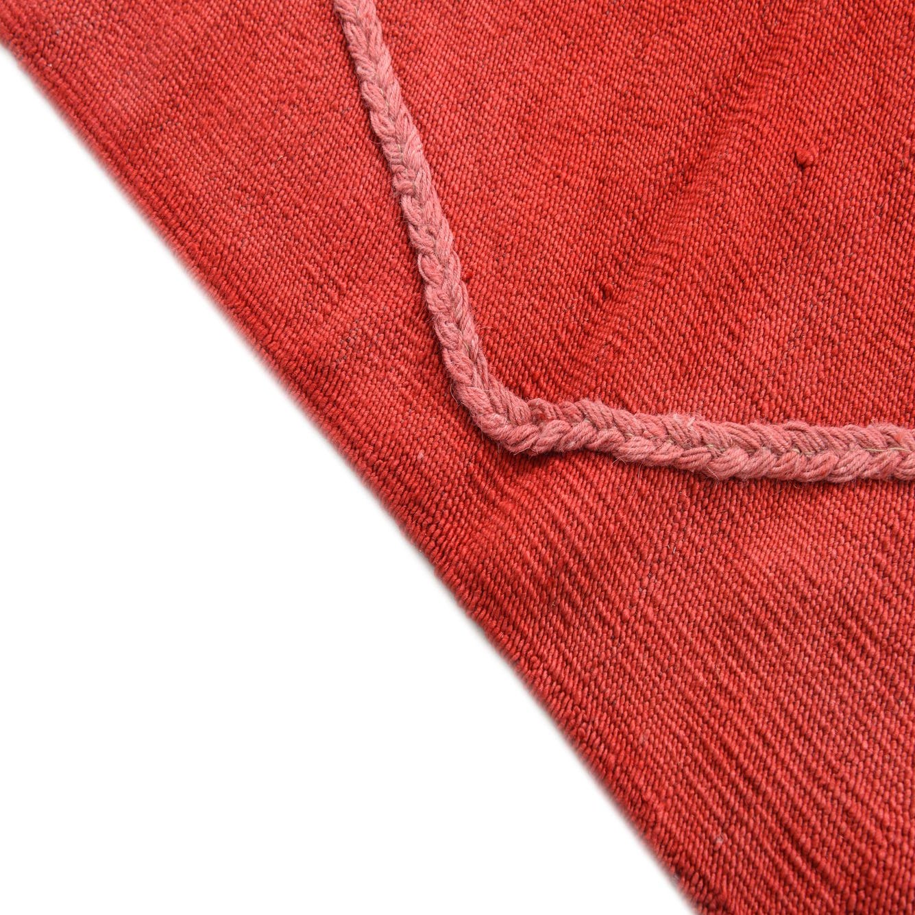 A 4x6 rectangular red tribal rug with a flatweave texture and light red diamond pattern, featuring fringed edges.
