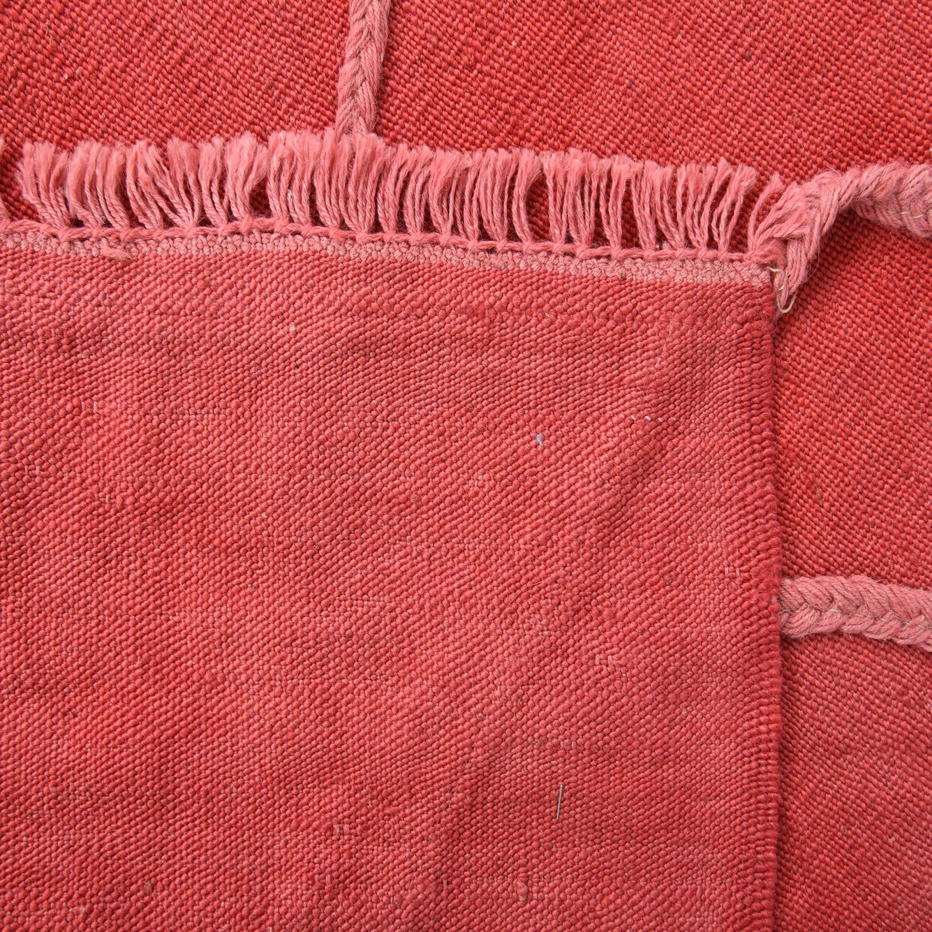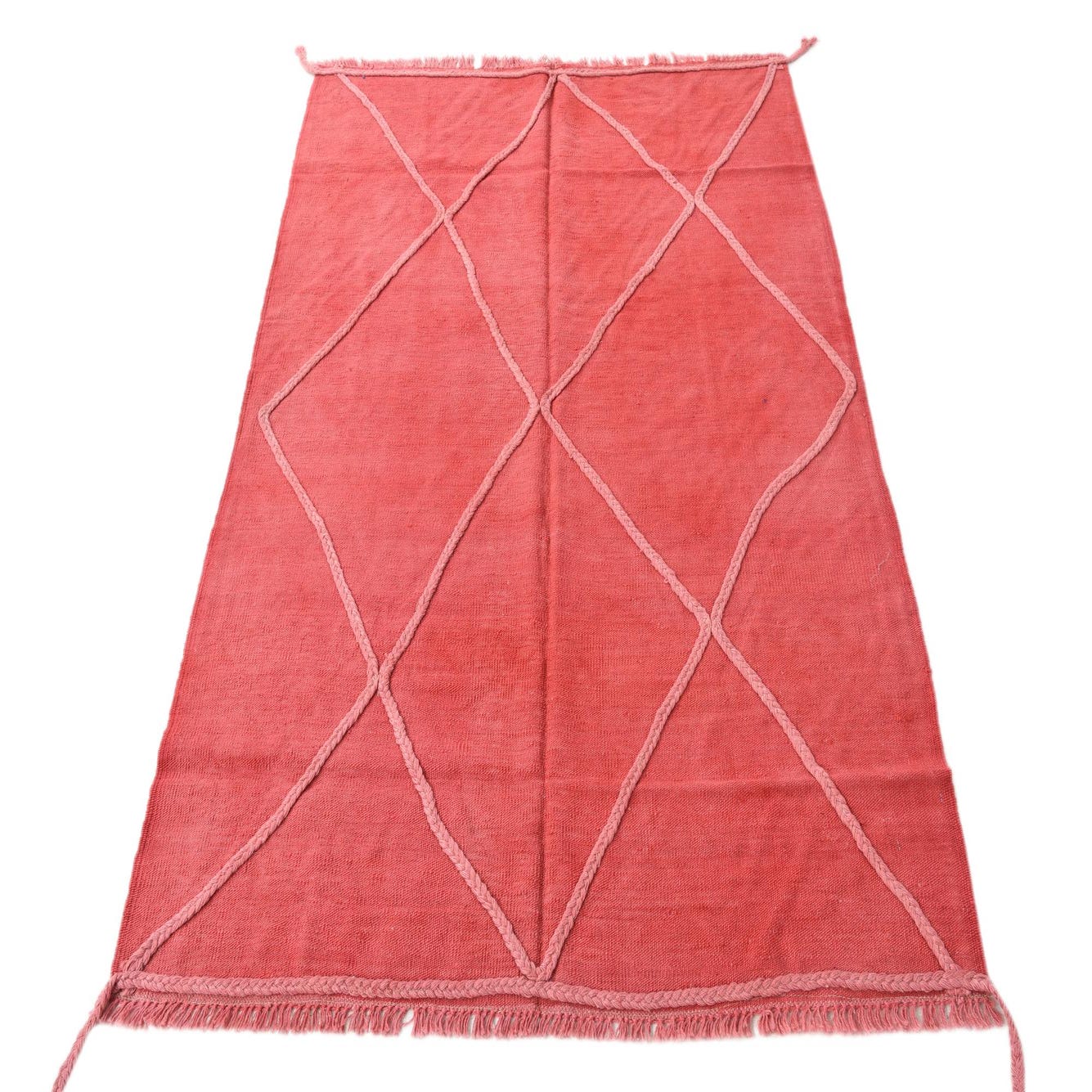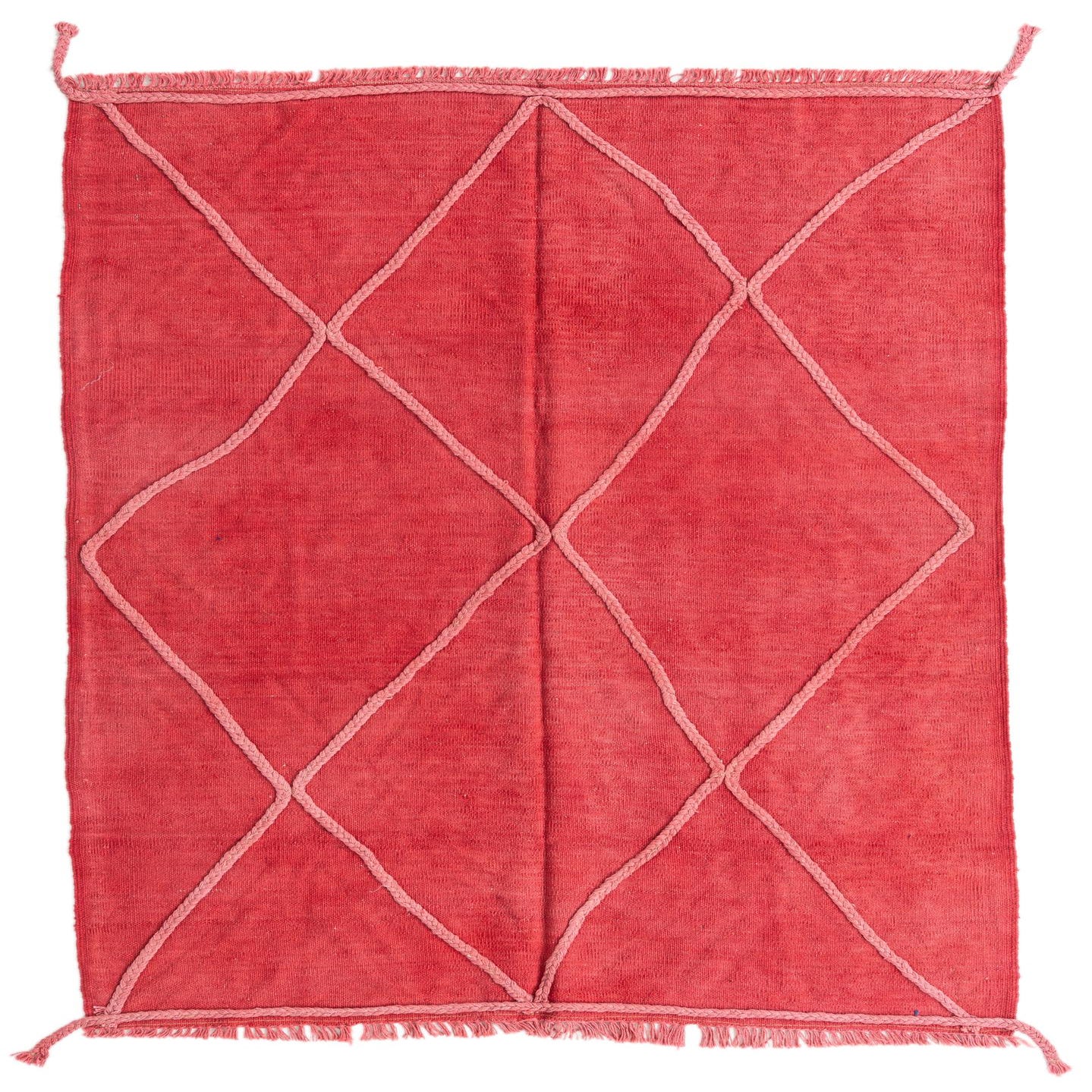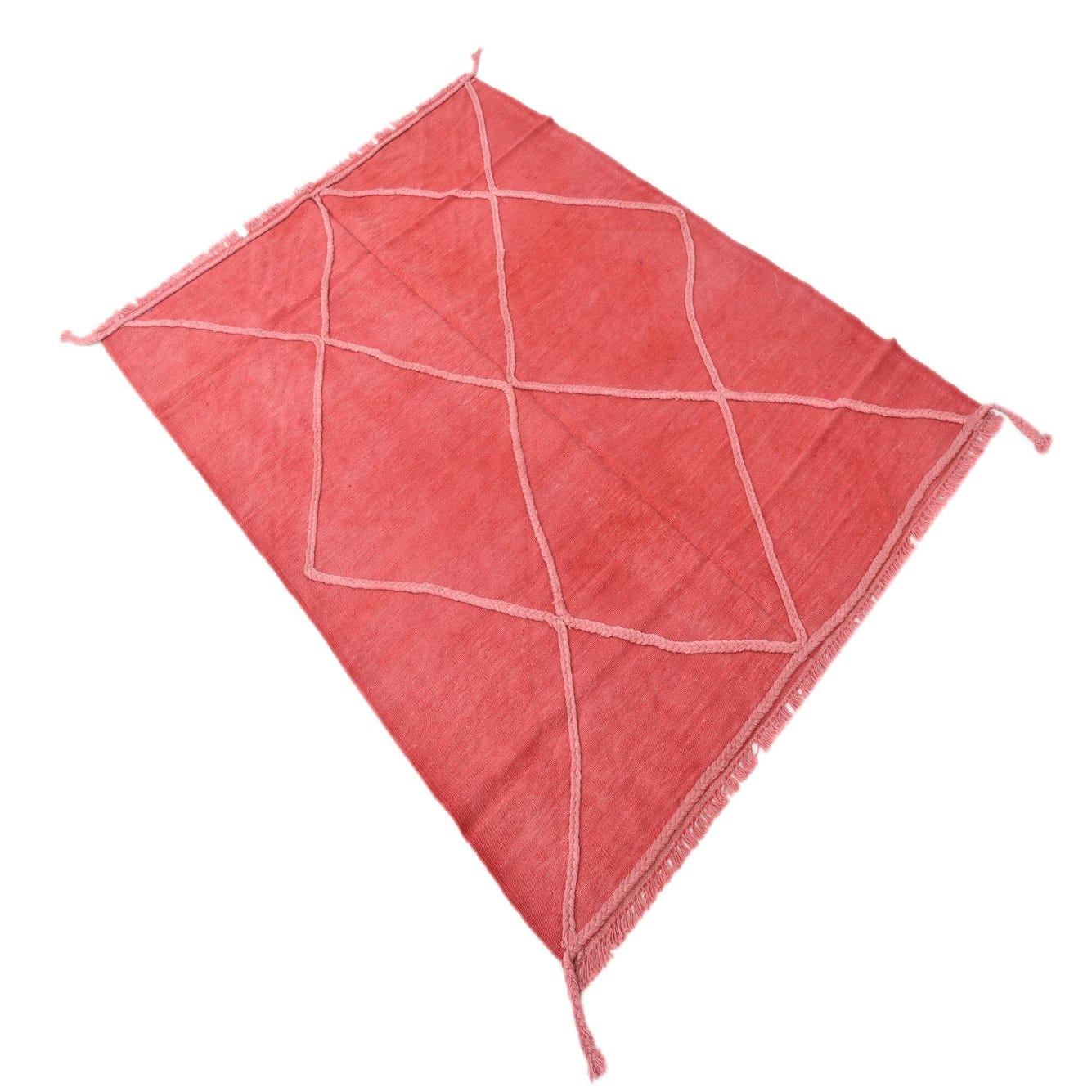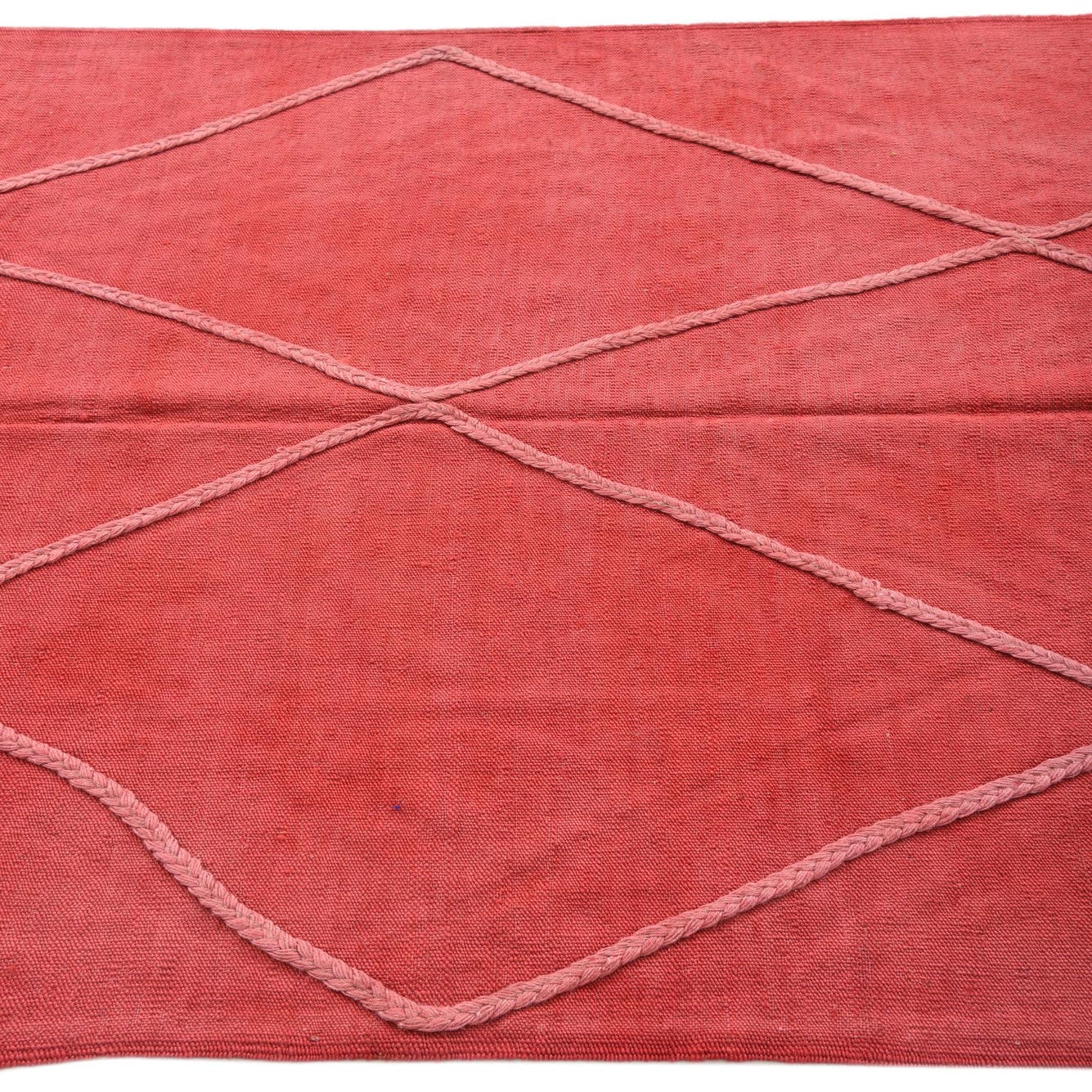 A 4x6 rectangular red wool flatweave rug with a light pink braided diamond pattern and fringed edges.