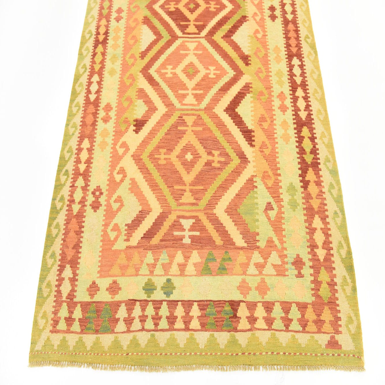 A 4x6 rectangular Kilim Waziri rug featuring a traditional tribal pattern in shades of red, orange, green, and cream.