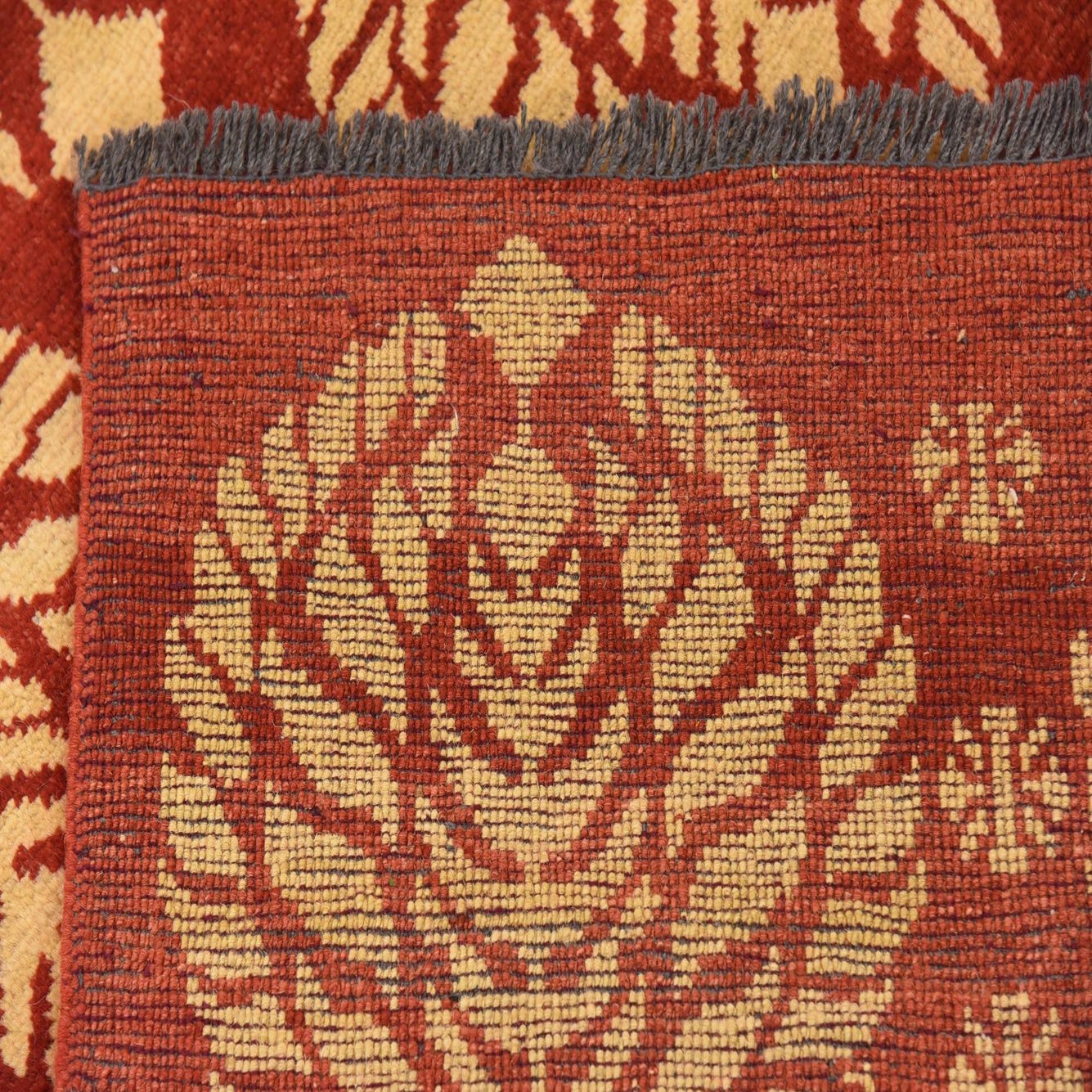 The texture of this hand-knotted wool rug provides a tactile quality that enhances its visual appeal. Attention to detail can be seen in the neatly tied fringe that completes the rug, adding a traditional touch to its craftsmanship.