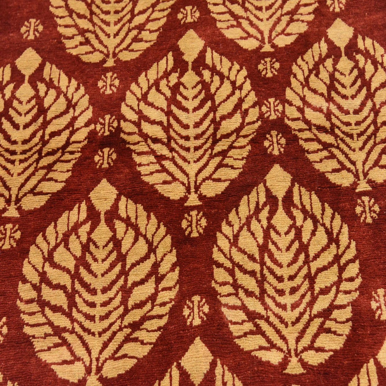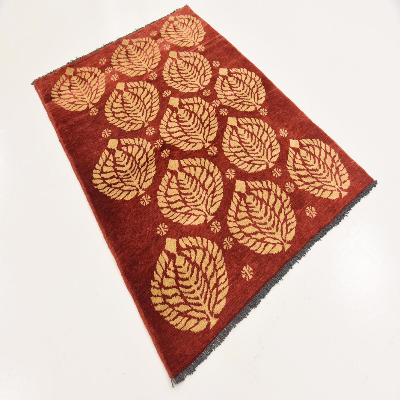 A 4x6 rectangular red wool rug with a repeating pattern of large golden leaf-like tribal motifs, perfect for a living room.
