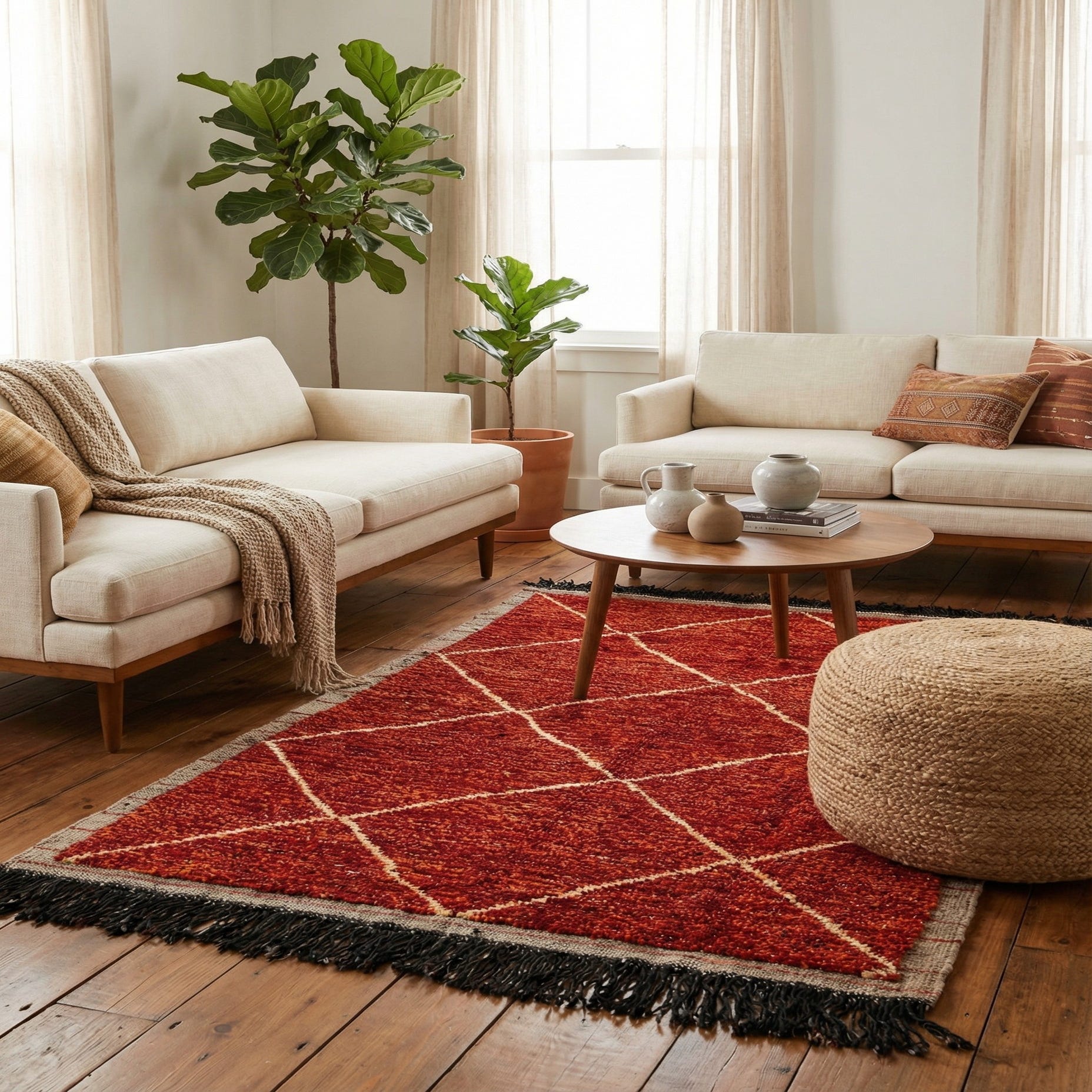 A 4x6 rectangular red shag rug with a cream diamond pattern, grey border, and black fringe.