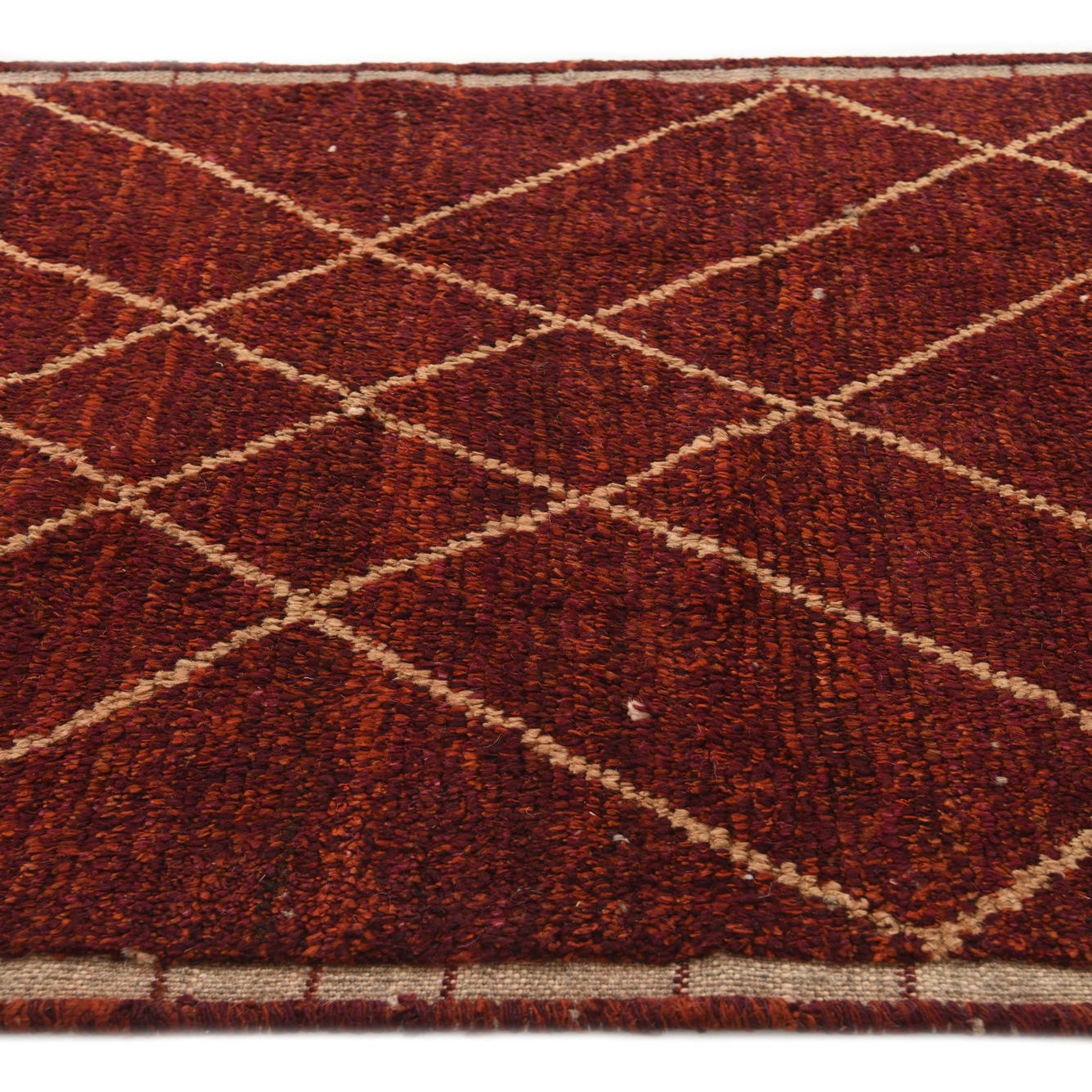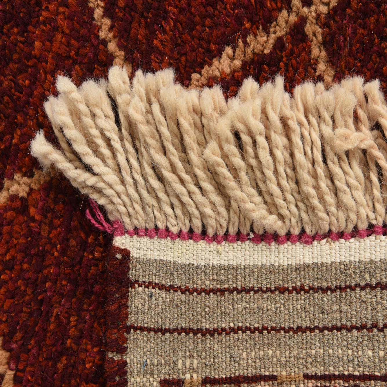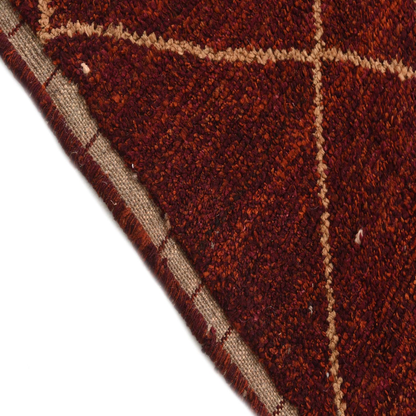 A 4x6 rectangular red Moroccan shag rug with a diamond tribal pattern and fringed ends, suitable for a living room.