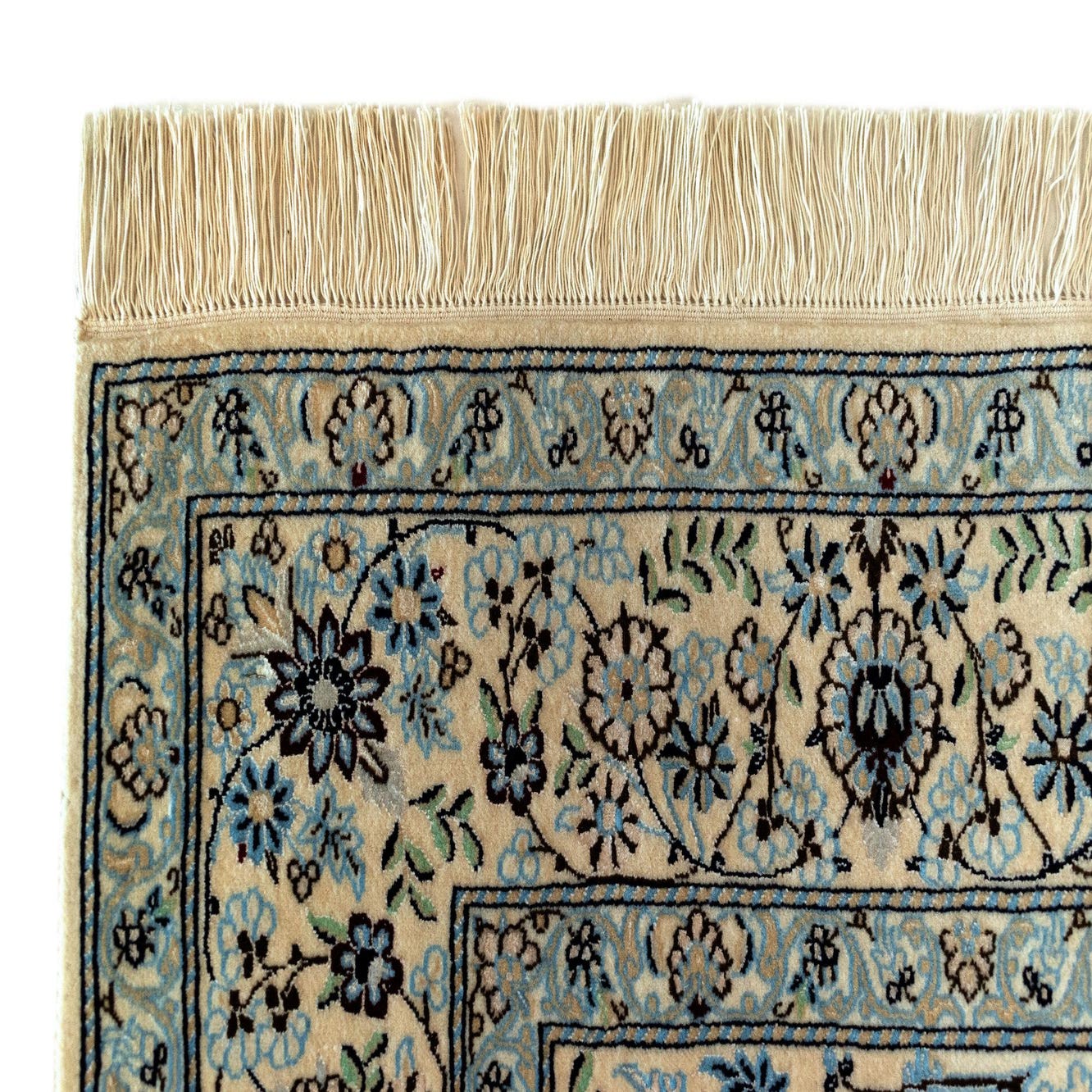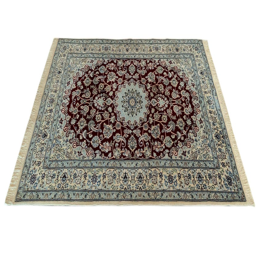 This Nain rug's classic color scheme and elaborate pattern position it as a versatile addition to various interior design settings. Ideal for bringing warmth and a sense of tradition, it could be a focal point in a living room, under a coffee table, or in a study to complement dark wooden furniture. Its elegant design also makes it suitable for a formal dining room, where its colors would enhance rich wooden tones and contribute to a refined atmosphere. The quality materials and detailed pattern make this rug an exceptional choice for those who appreciate timeless design and craftsmanship.