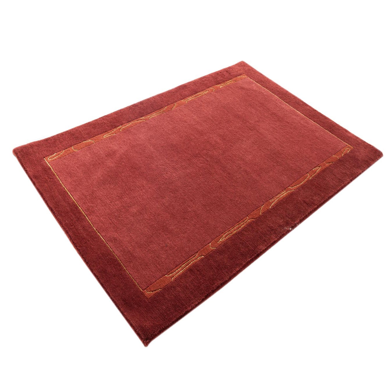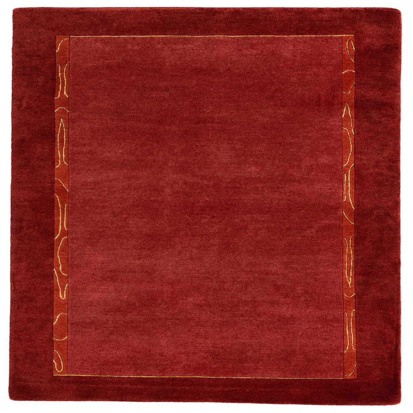 A 4x6 rectangular red wool and silk rug with a darker red border and an inner gold abstract pattern.