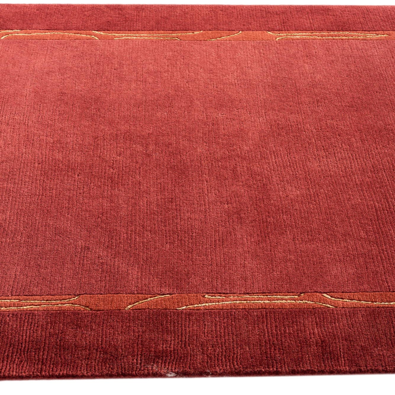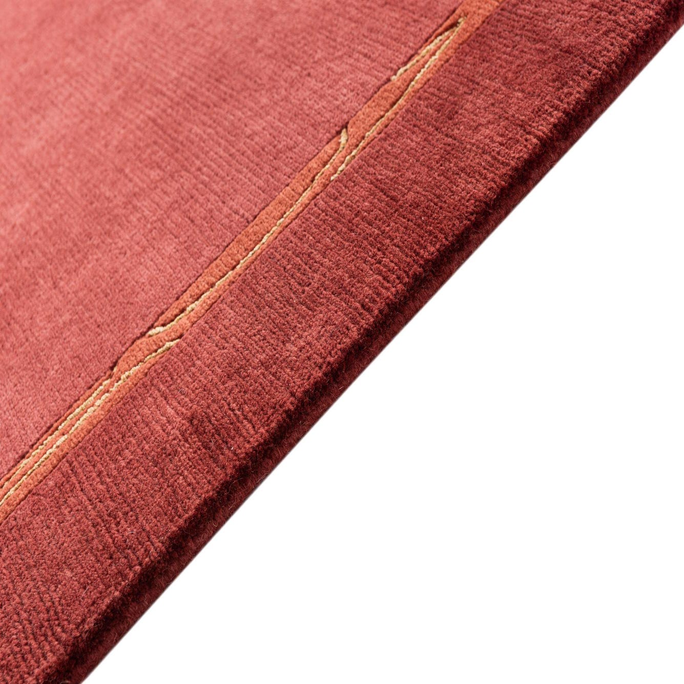 Hand-knotted wool and silk construction gives this rug a dense, velvety pile with a soft silk sheen that catches light across the surface. The main field is a warm red, framed by a slightly deeper red border. A fine gold line traces an inner rectangle and narrow vertical bands with organic, linear motifs add rhythmic contrast without overwhelming the overall simplicity. Raking a hand over the pile highlights the silk’s subtle luster against the wool’s resilient, plush feel.