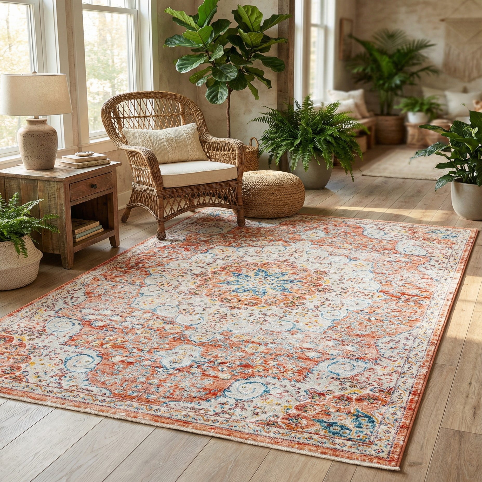 An ornate medallion and scrolling floral pattern sits against a warm red field, softened by an ivory central area and scattered accents of light blue, rust red and terracotta. The design has a gently distressed finish that gives the motifs a lived-in, vintage character while still keeping details legible—the central starburst medallion and surrounding arabesques remain the focal point. Machine-made from 100% polypropylene, the rug has a low, softly cushioned pile with a subtle sheen and a fine-textured surface that feels smooth underfoot.