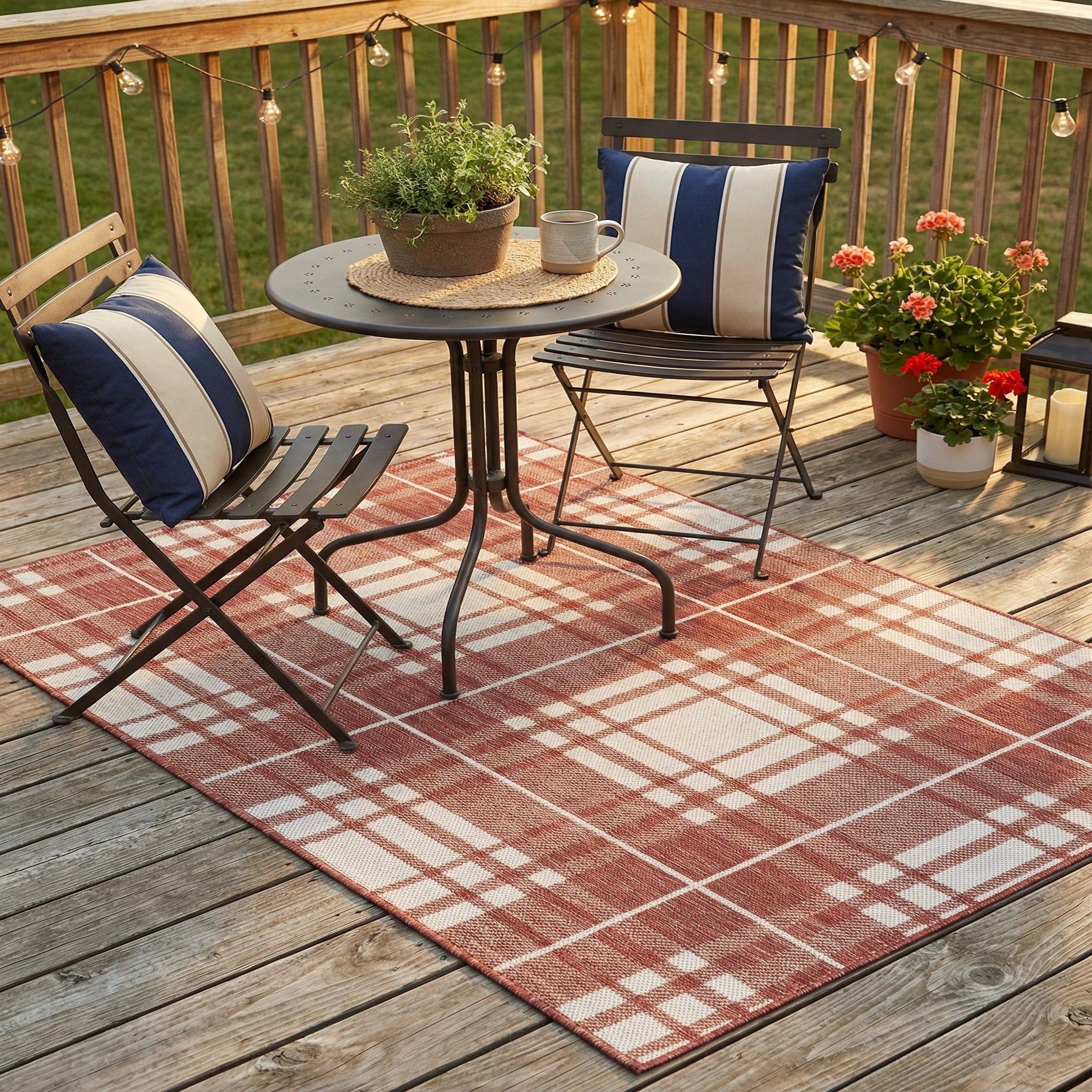 A 4x6 rectangular indoor/outdoor rug featuring a modern red and white checkered plaid pattern.
