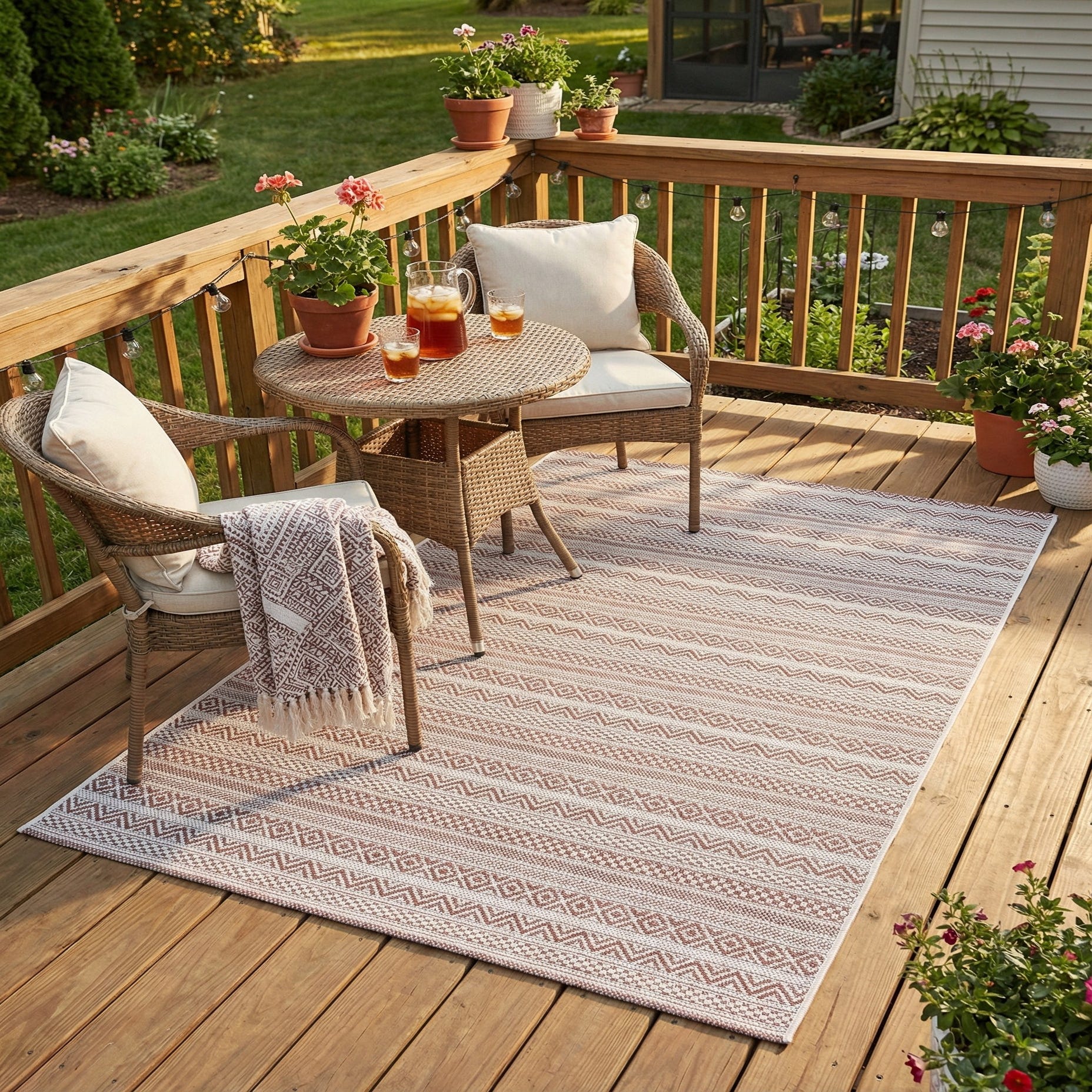 Built for everyday settings, it works well on covered patios and sunrooms, as a grounding piece for casual living areas, or as an easy-to-layer option in mudrooms and entryways. Pair it with natural wicker or teak seating and striped outdoor cushions for a relaxed porch setup, combine it with black metal furniture and neutral linens for a modern outdoor dining area, or use it to add color and pattern to a farmhouse-style kitchen with simple wood furnishings and warm textiles.