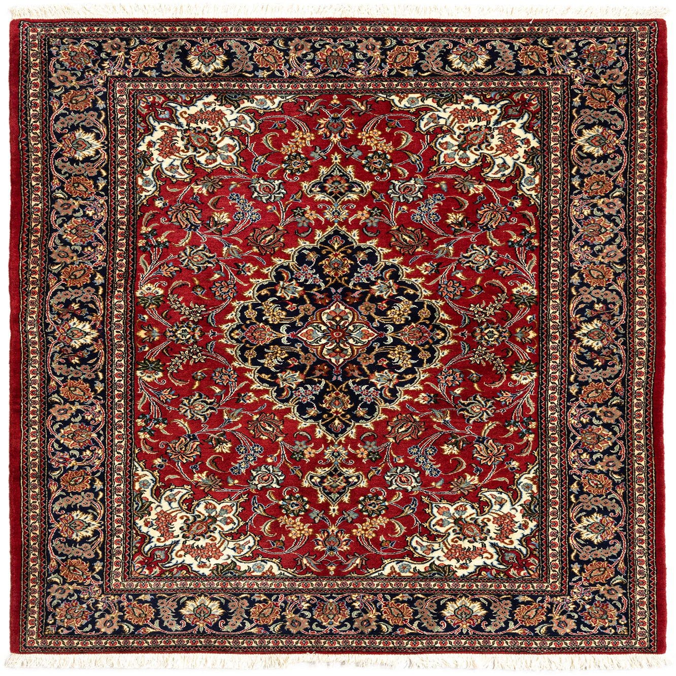 A 4x6 rectangular red Persian rug with an intricate floral medallion pattern in navy, cream, and gold, featuring a detailed border.