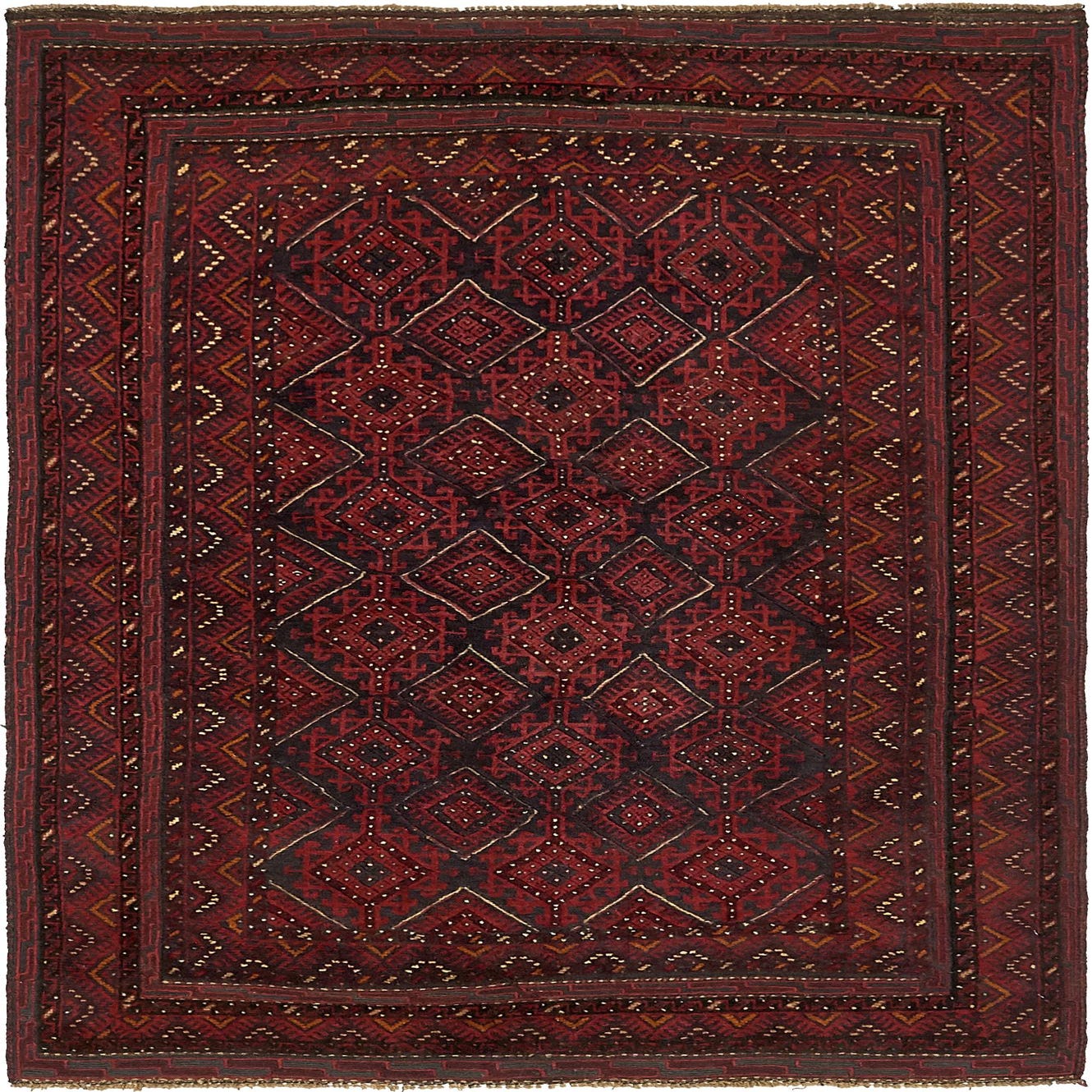 Primary color is Red. Colors in this rug include: Red, Beige, Black, Burgundy, Ivory, Orange.